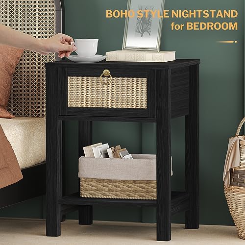 SICOTAS White Nightstand,Rattan Decor Drawer with Brass Knobs Night Stand Natural Wood Bedside Table Boho End Table Side Table with Storage Shelf