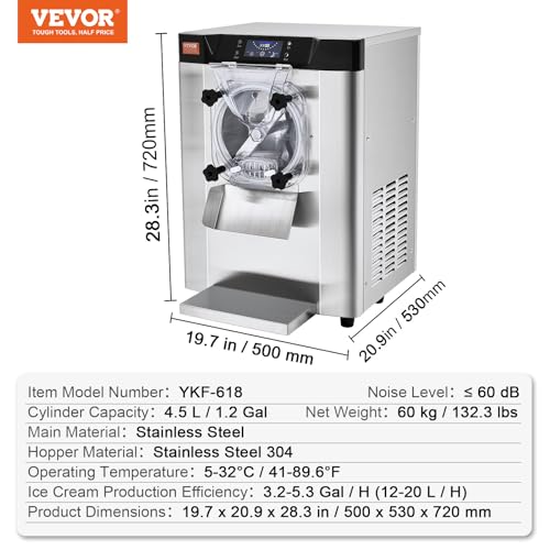 VEVOR Commercial Ice Cream Machine 1400W 20/5.3 Gph Hard Serve Ice Cream Maker with LED Display Screen Auto Shut-Off Timer One Flavors Perfect for Restaurants Snack bar Supermarkets