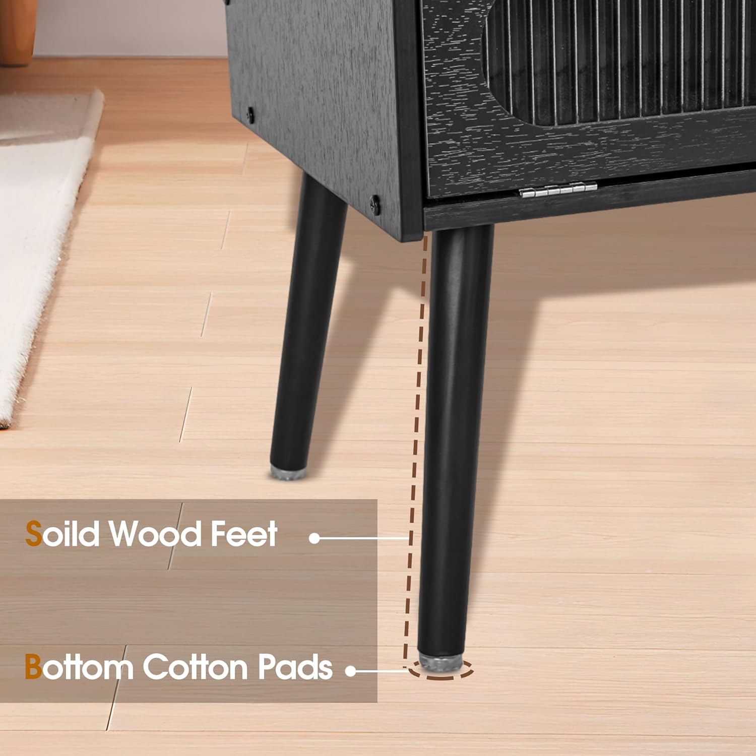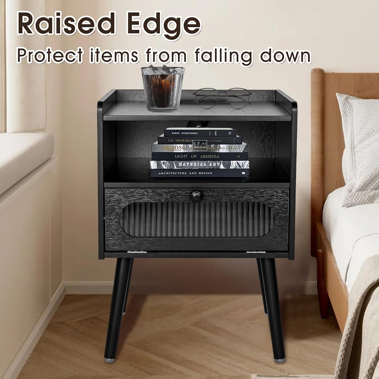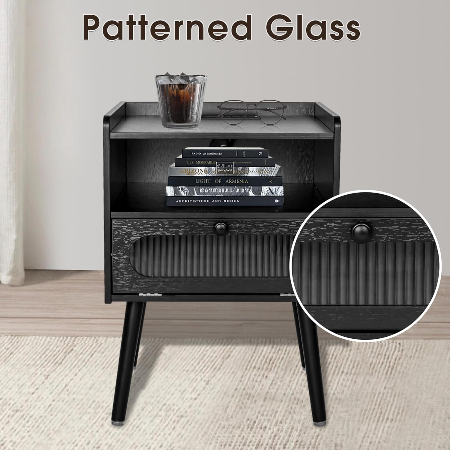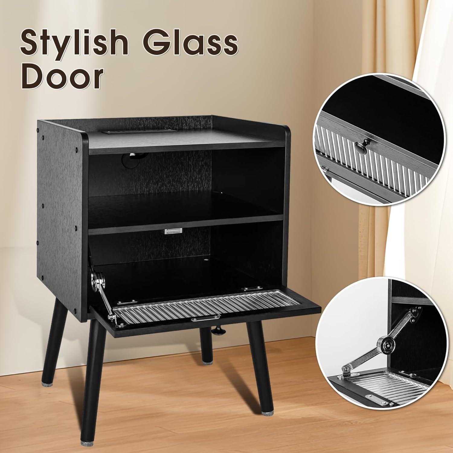 Mid Century Modern Nightstand with Charging Station, Bedside Tables with Glass Decorative Door, End Table Side Table with 2 Tiers Storage Space, for Bedroom, Living Room(1pcs)