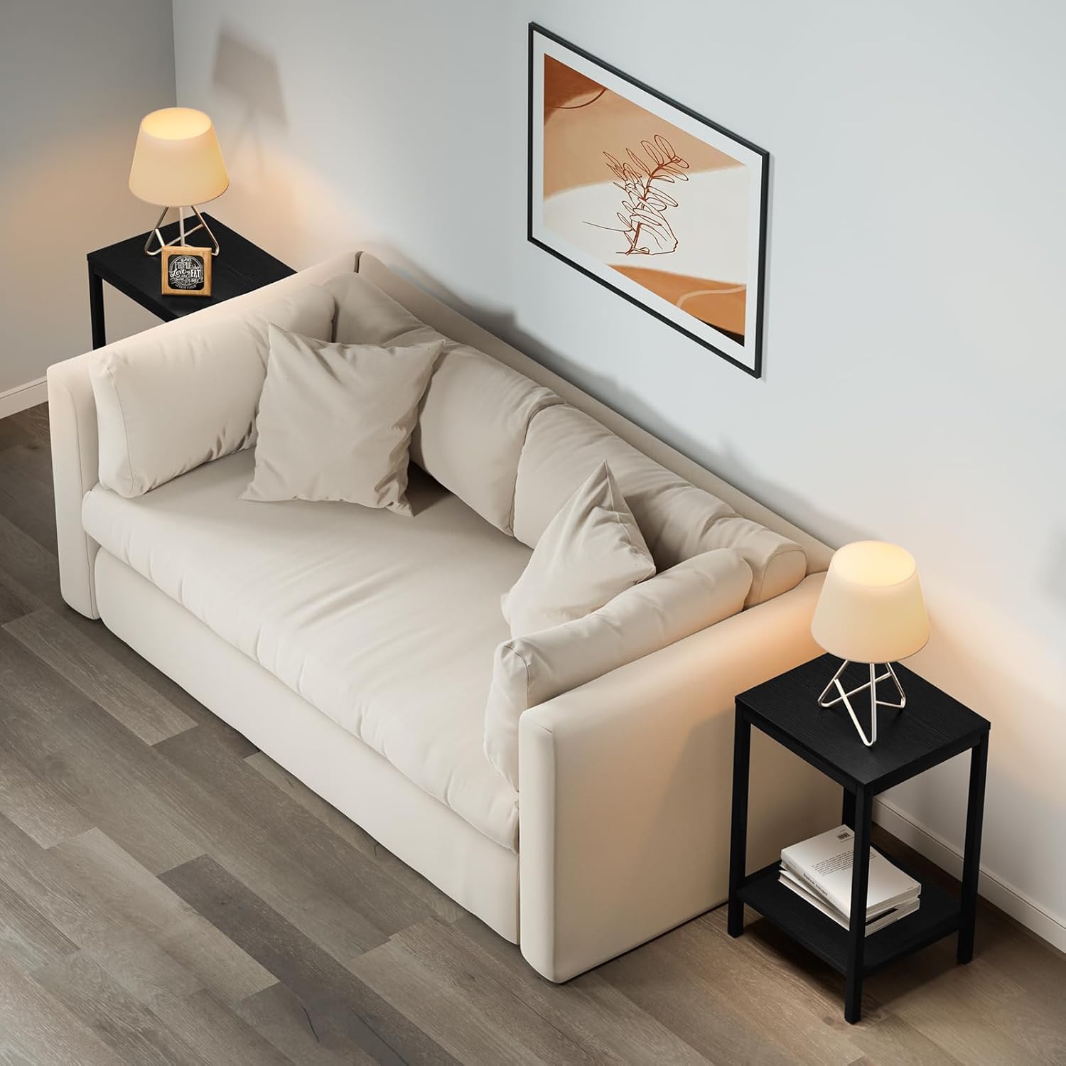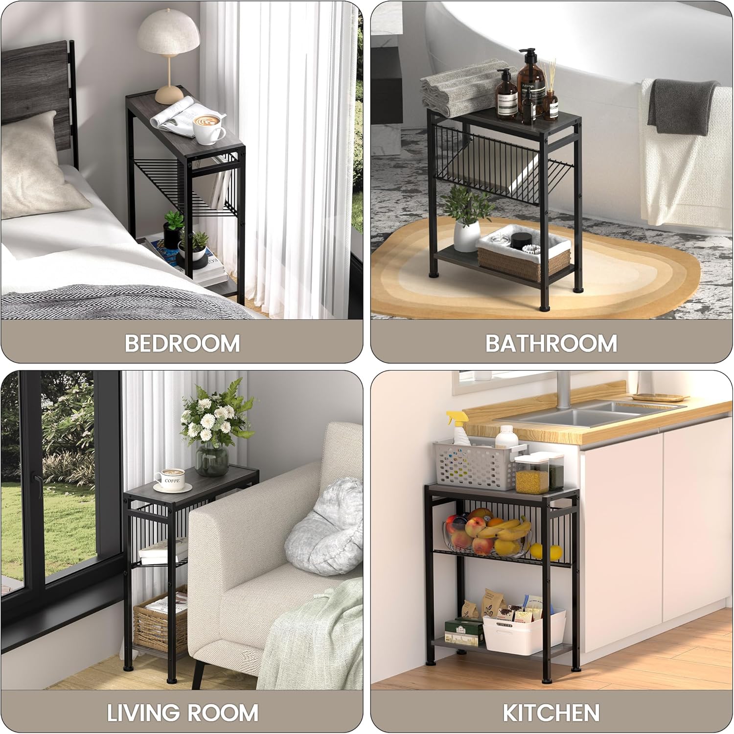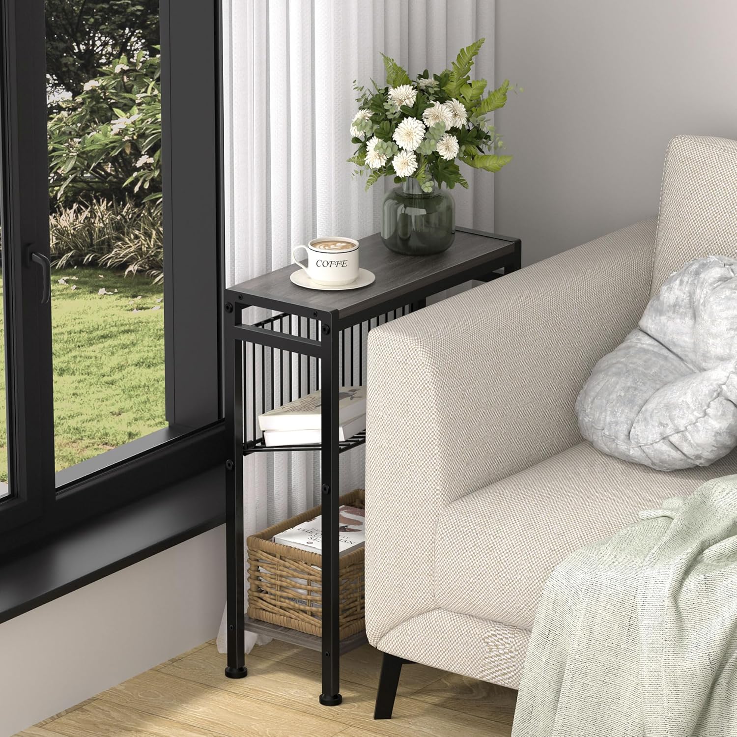 Small End Table for Small Space, 3-Tier Narrow Side Table with Magazine Holder (Black) & (Grey)