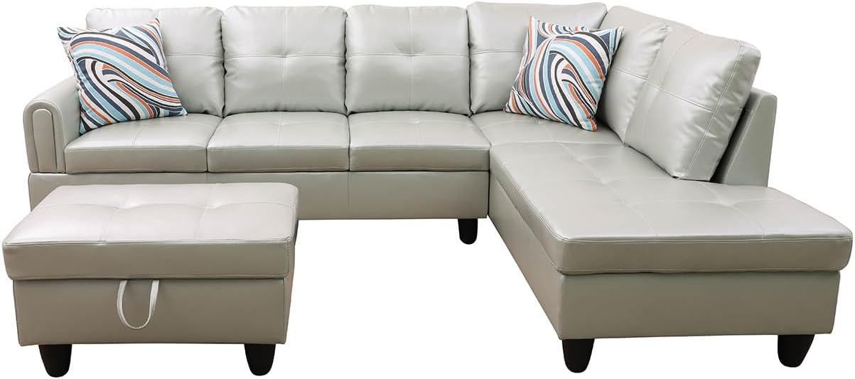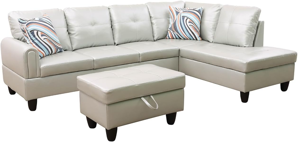 3-Piece L-Shaped Sectional Couches Lounge & Storage, 97.5'' Linen Modular Living Room Home Office, 3pcs 97'' Sofa+66.5'' Chaise+28.5'' Ottoman(Right), Silver Green Faux Leather