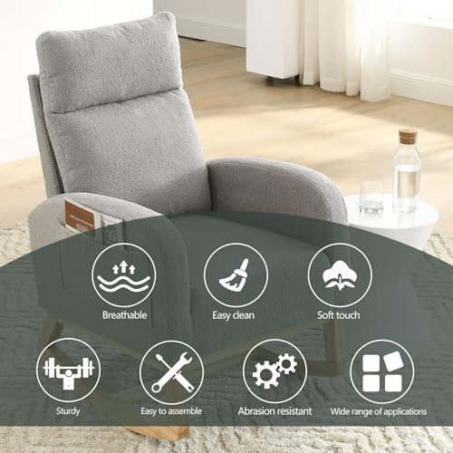 Modern Rocking Glider Chair, Teddy Fabric Upholstered Accent Rocker Chair with High Backrest and Armrests, Leisure Single Sofa with Wooden Legs and Side Pockets, for Living Room Bedroom Office, Coffee