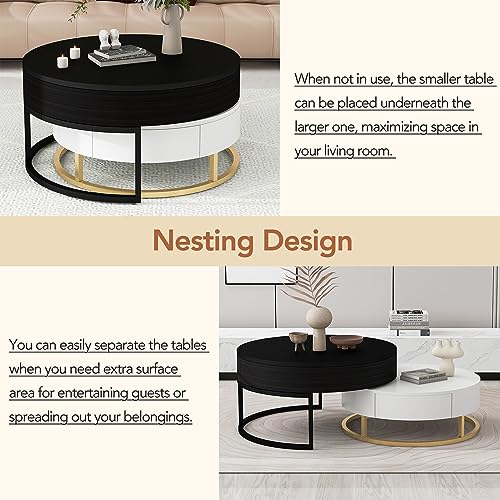 31.5" Lift Top Nesting Coffee Table Set of 2,Round Coffee Tables with 2 Drawers and Metal Frame,Luxury Modern Accent Center Table Side Table for Living Room,Black