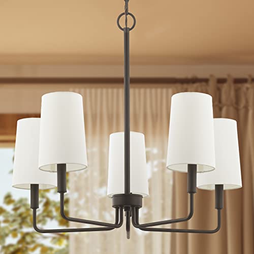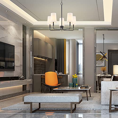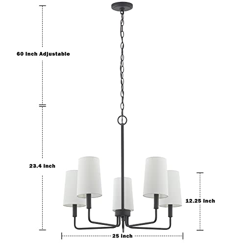Chandelier, Matte Black with White Fabric Shade, Farmhouse Linear Island Lighting Fixture for Kitchen, Dining Room (5-Light Matte Black with Fabric Shades)