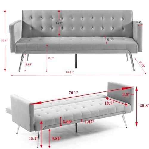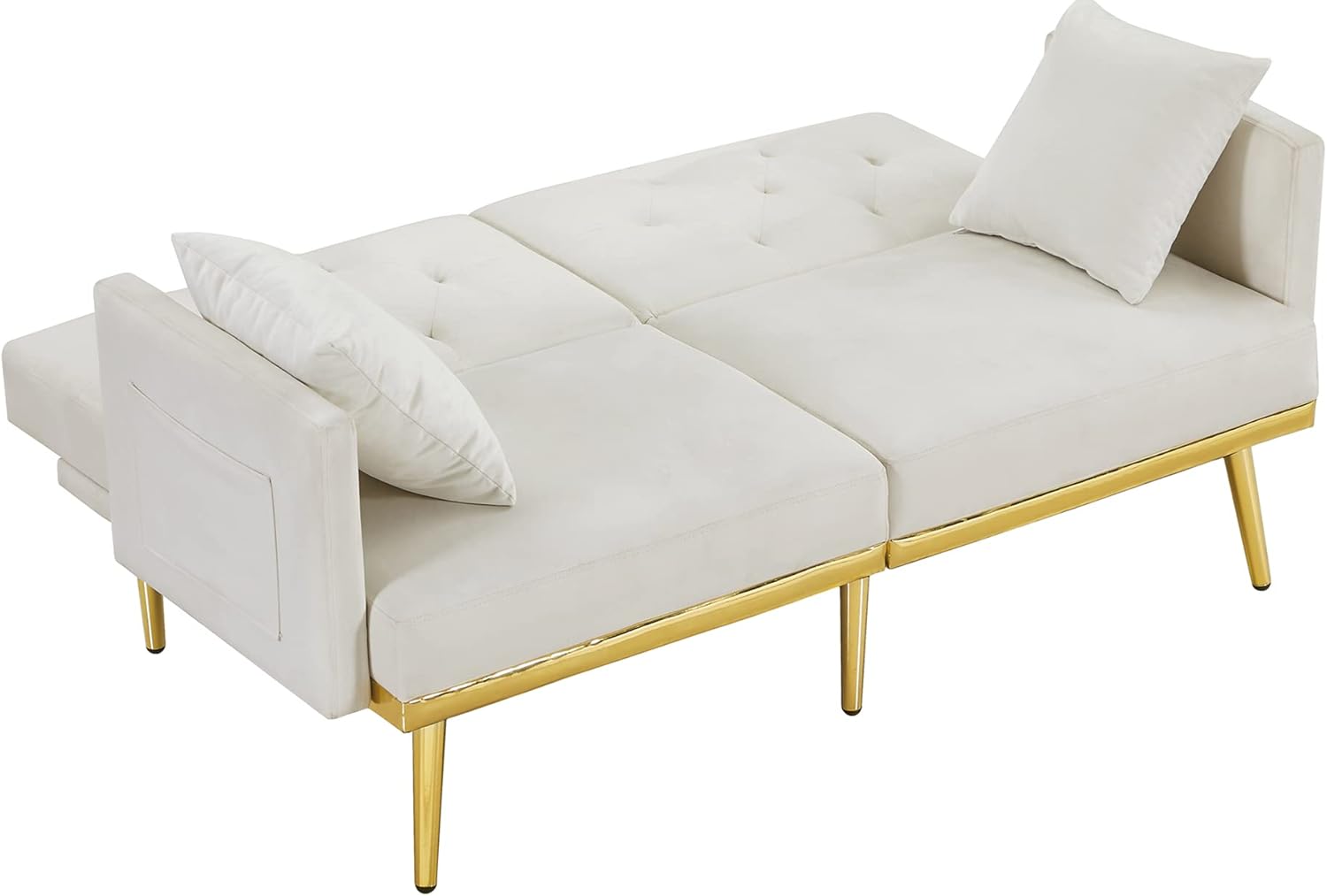 Velvet Convertible Futon Sofa Bed Upholstered Sofá Golden Metal Legs, Loveseat Couch Sleeper 2 Seating w/Adjustable Backrest for Home Living Room Bedroom Apartment and Dorm, White Side Pocket