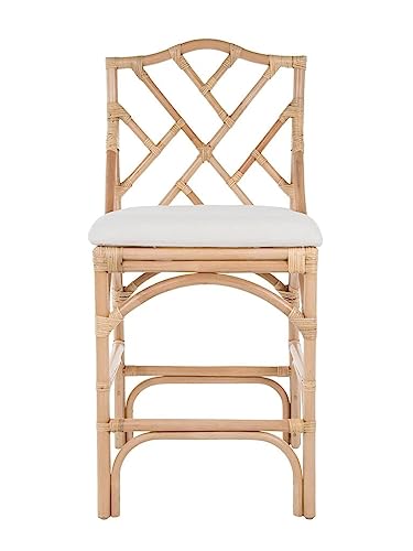 KOUBOO Chippendale Rattan Bar Stool, Indoor, Handmade, Rattan, Bar Seating, Tall, Wood Bar Stool, Back Support Stool, Off White Upholstery, Natural