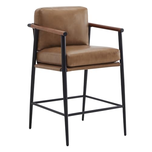 Watson & Whitely Mid Century Modern Barstools Set of 2, 26" H Upholstered Counter Height Bar Stools with Wood Armrests and Metal Legs, Faux Leather in Saddle Brown