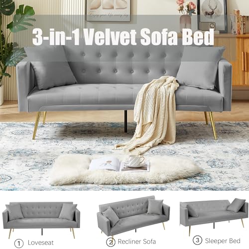Modern Velvet Futon Sofa Bed, Convertible 3 Adjustable Couch Loveseat with 2 Pillows, Folding Upholstered Sleeper with 5 Metal Leg for Living Room Apartment Office Bedroom (Pink)