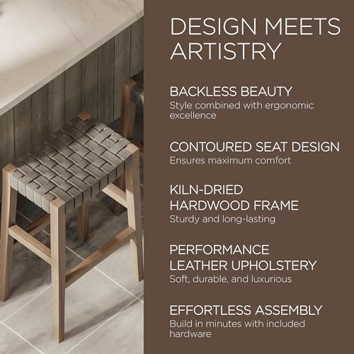 Maven Lane Emerson 31 Inch Tall Bar Height Backless Saddle Barstool in Weathered Grey Wood Finish with Ronan Stone Vegan Leather Seat, Set of 4