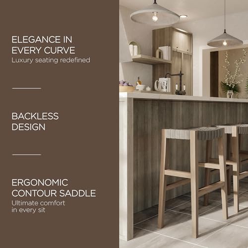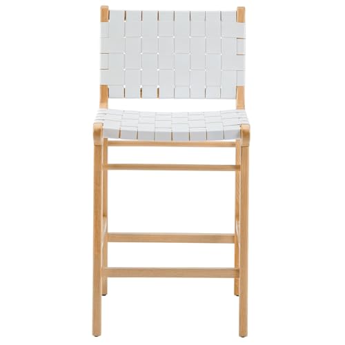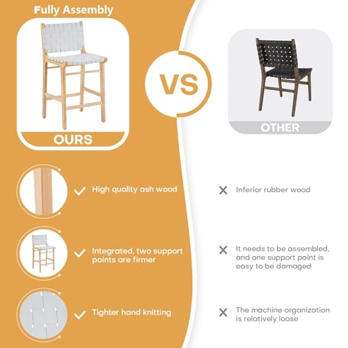 Counter Height Bar Stools Set of 3, Fully Assembly Cowhide Leather Woven Strips Counter Stool, 25.6" Ash Wood Barstools Farmhouse Modern Kitchen Stool Island Bar Chair, White and Natural Frame