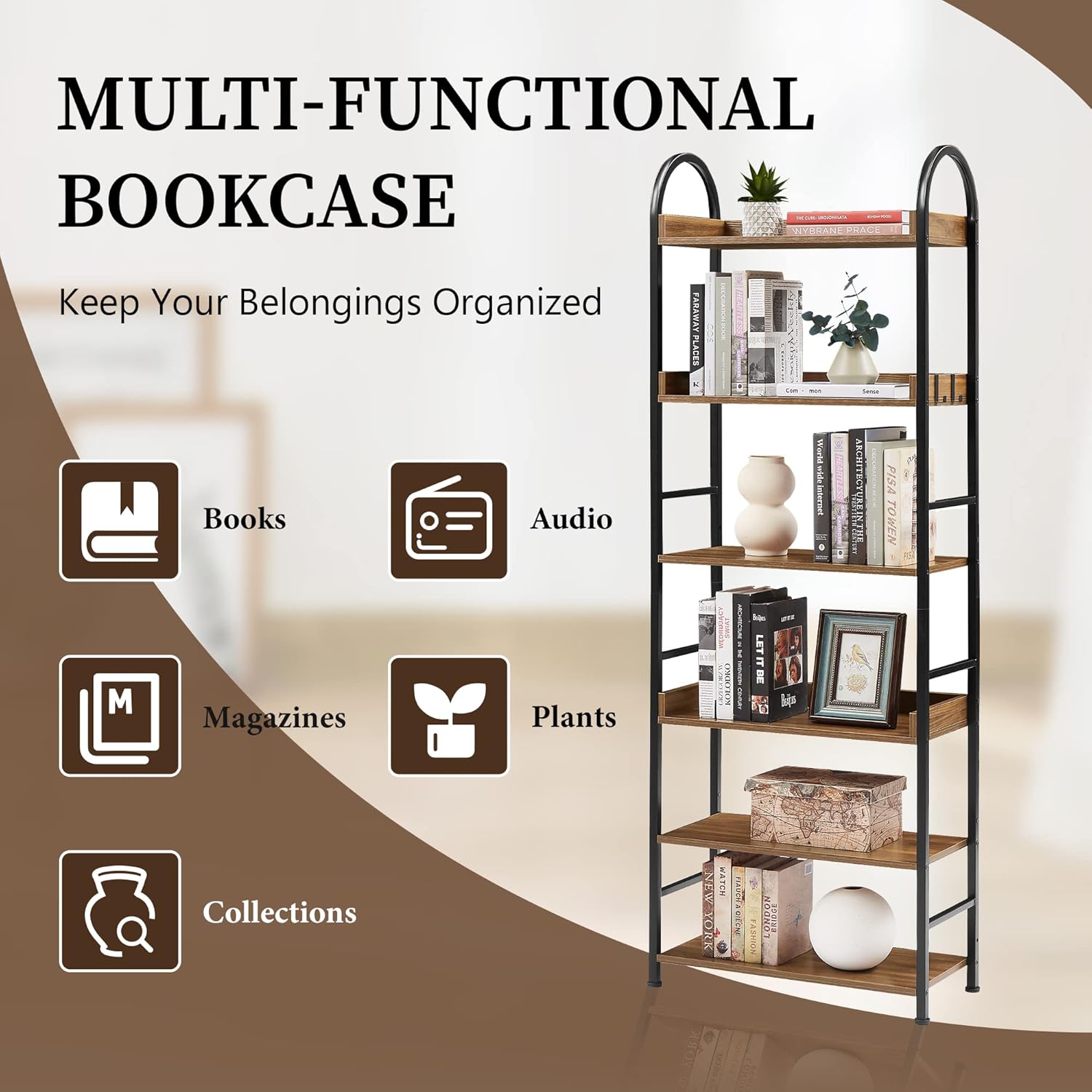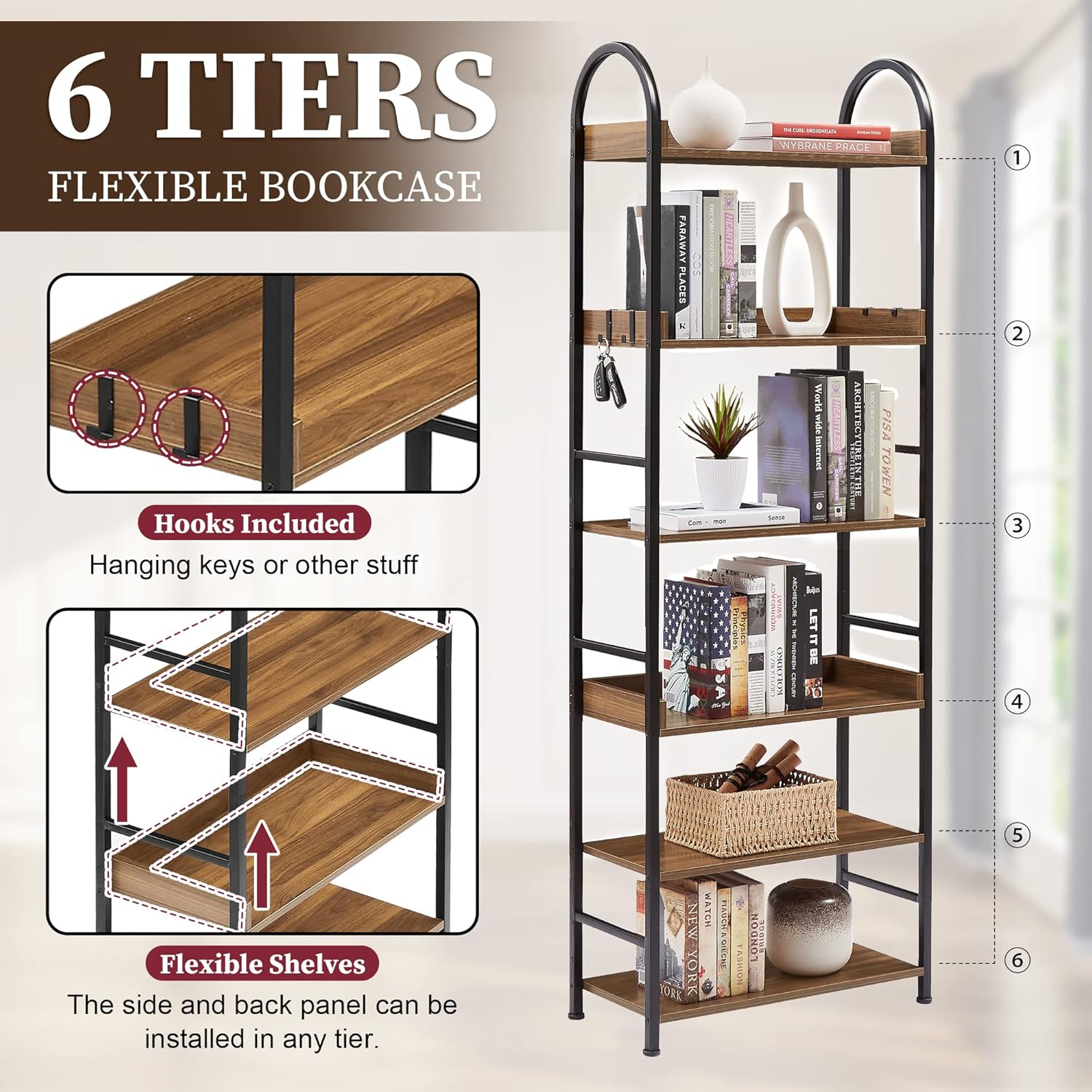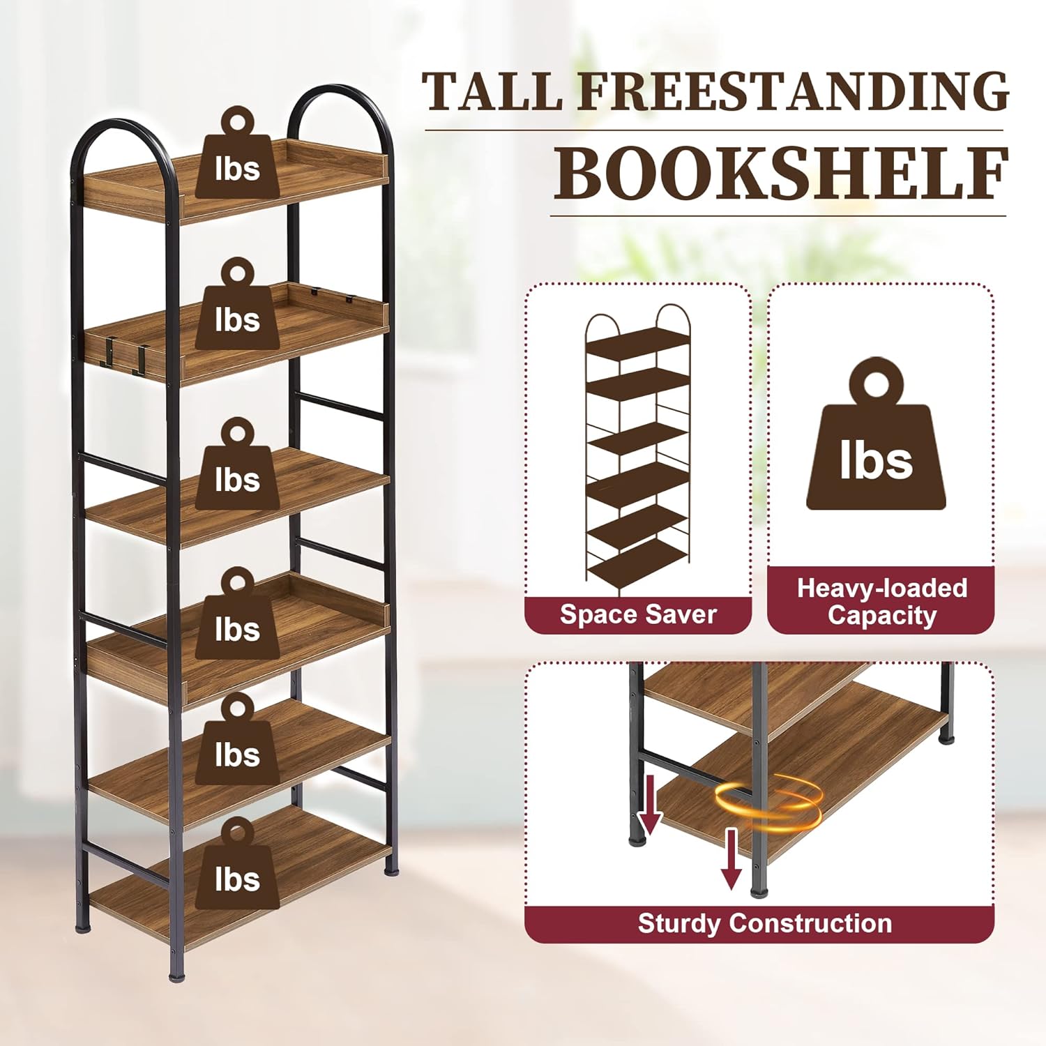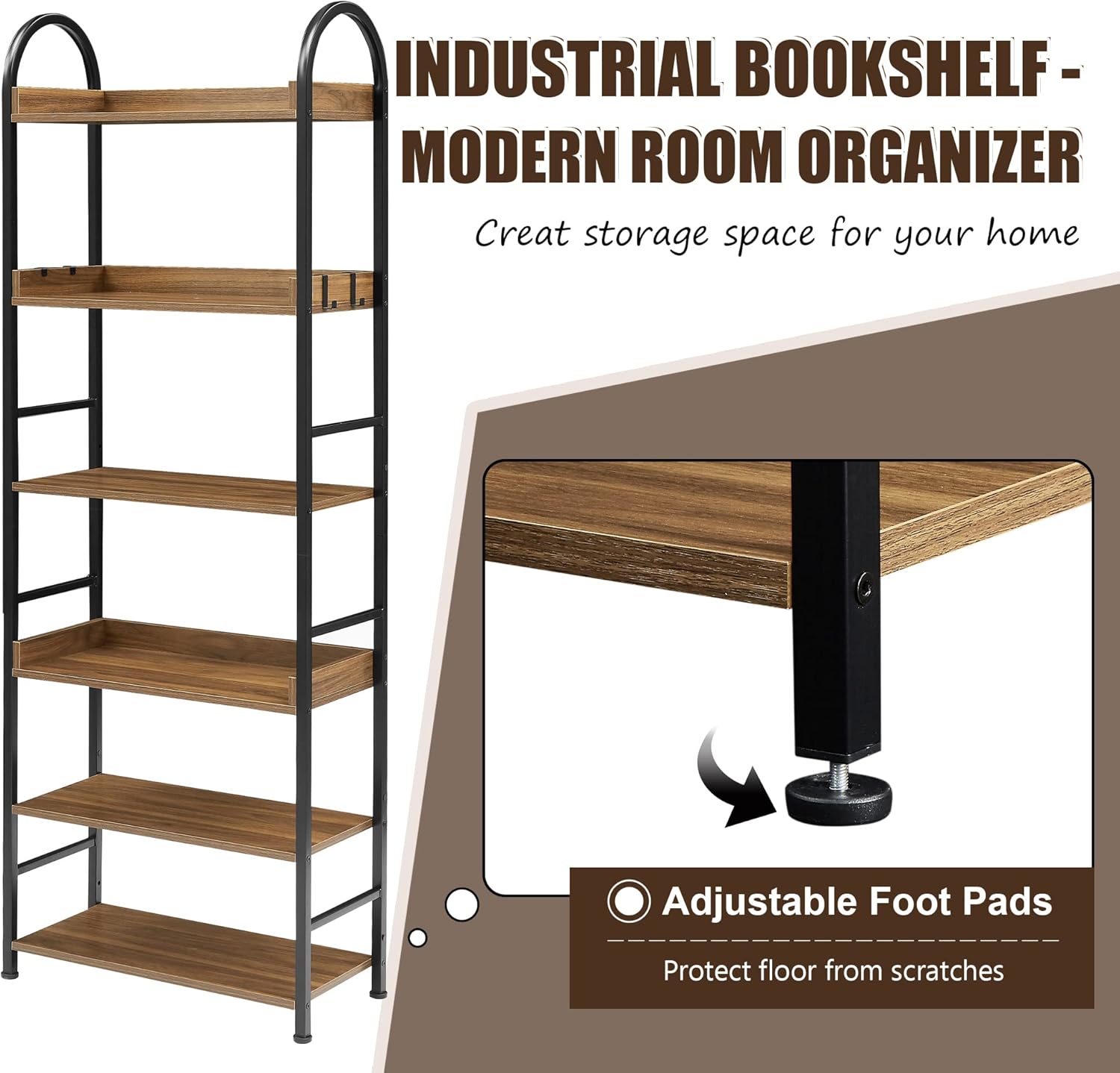 Merax 6 -Tier Tall Bookshelf Bookcase, Open Industrial Open Storage and Display Shelves with Hooks