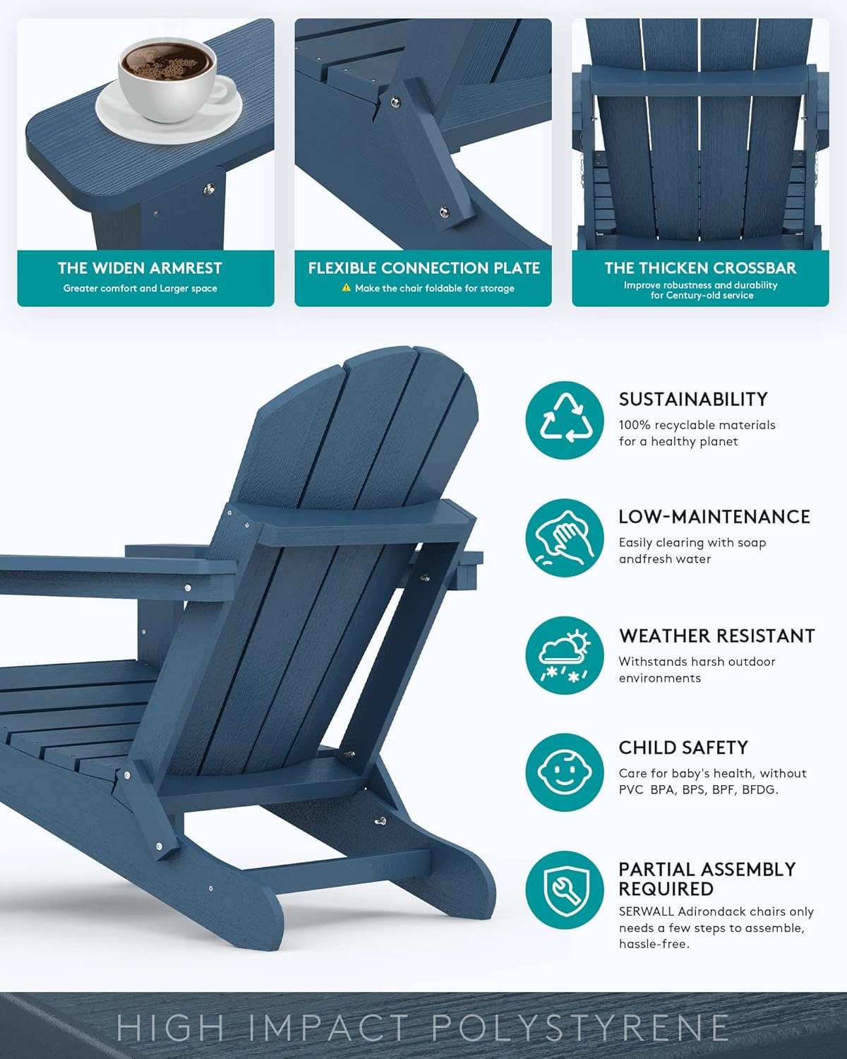 SERWALL Folding Adirondack Chair with Side Table 3-Piece Adirondack Chair Set, Blue(includes 2 Chairs and 1 Table)