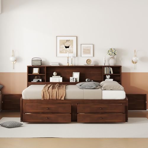 Twin Size Platform Bed with Storage Drawers and Headboard, Pine Wood Daybed with Desk Chair Set and Shelves for Kids Boys Girls, Natural+White