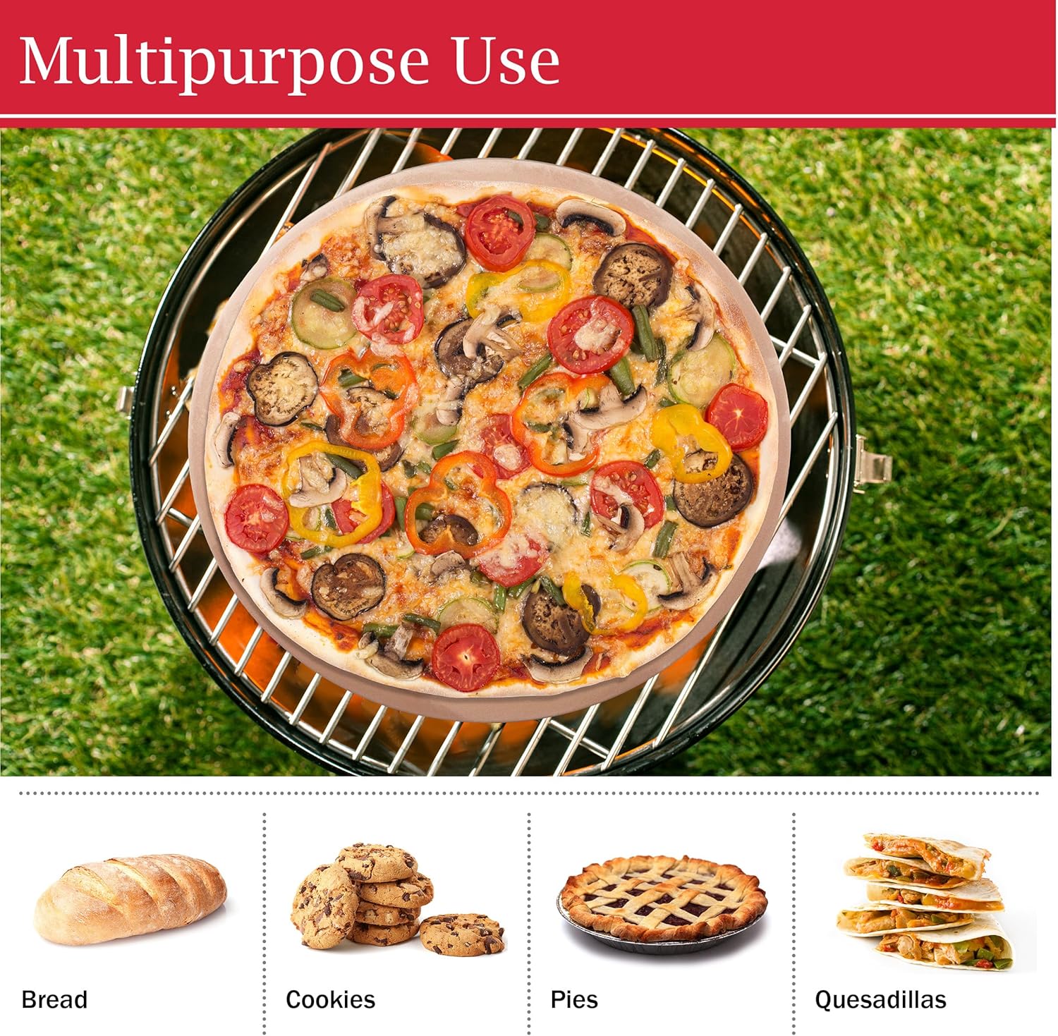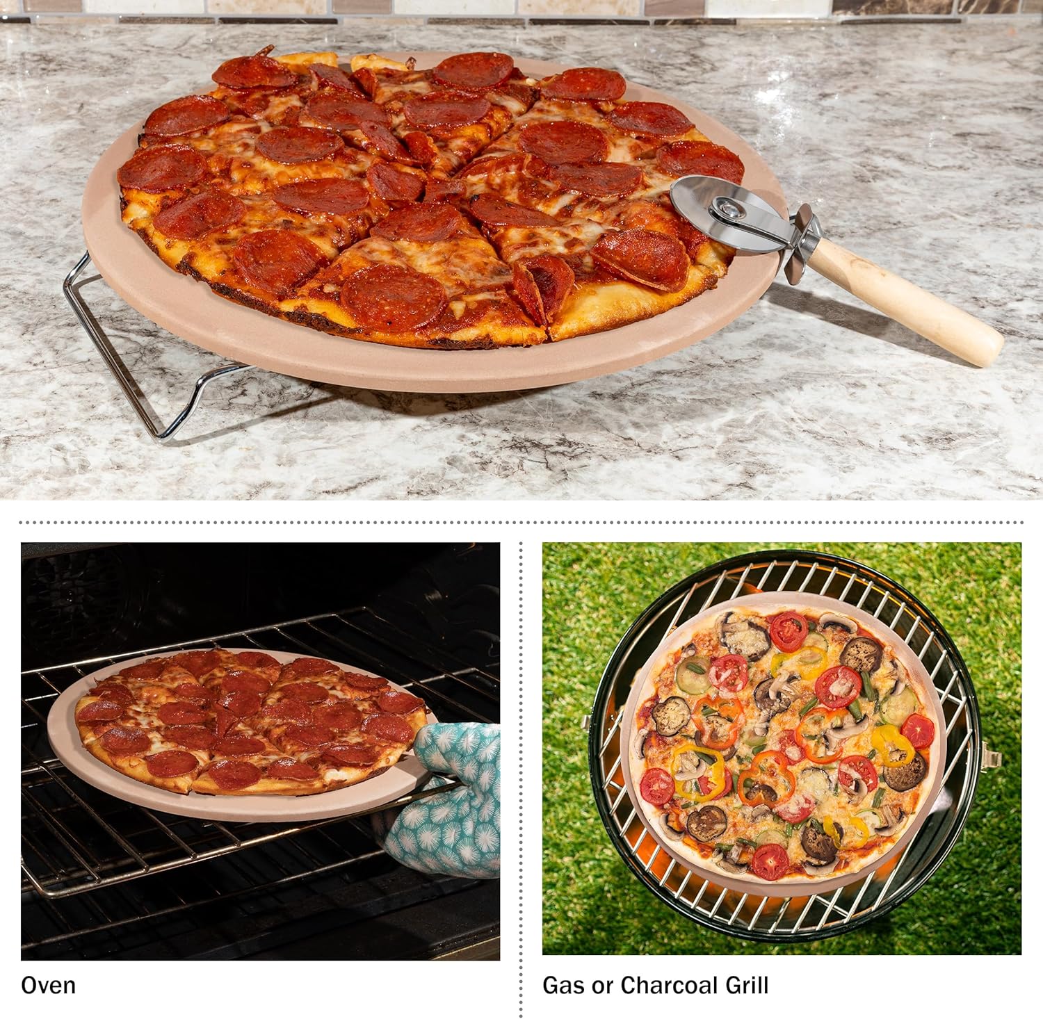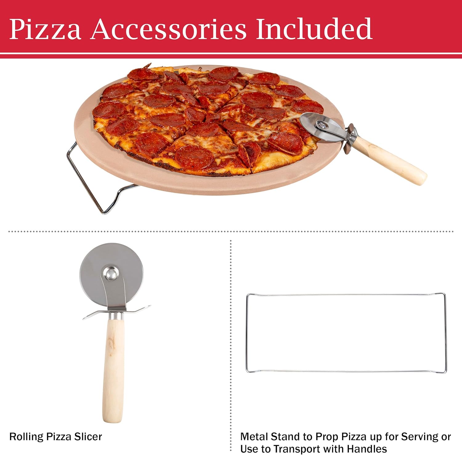 Pizza Stone - 15-Inch Pizza Stone for Oven or Grill with Pizza Cutter and Metal Serving Rack/Handles - Pizza Oven Accessories by Classic Cuisine