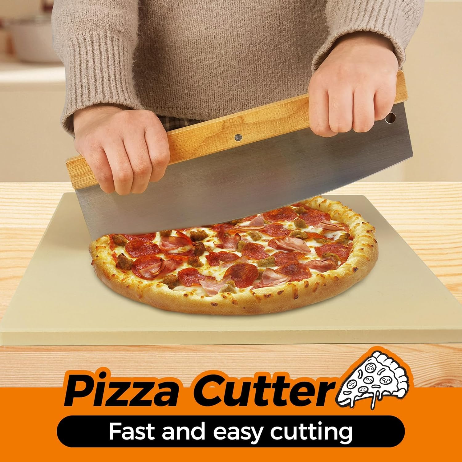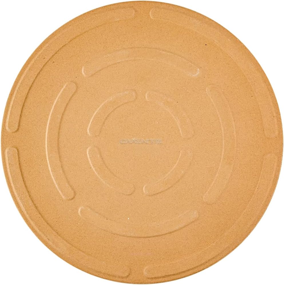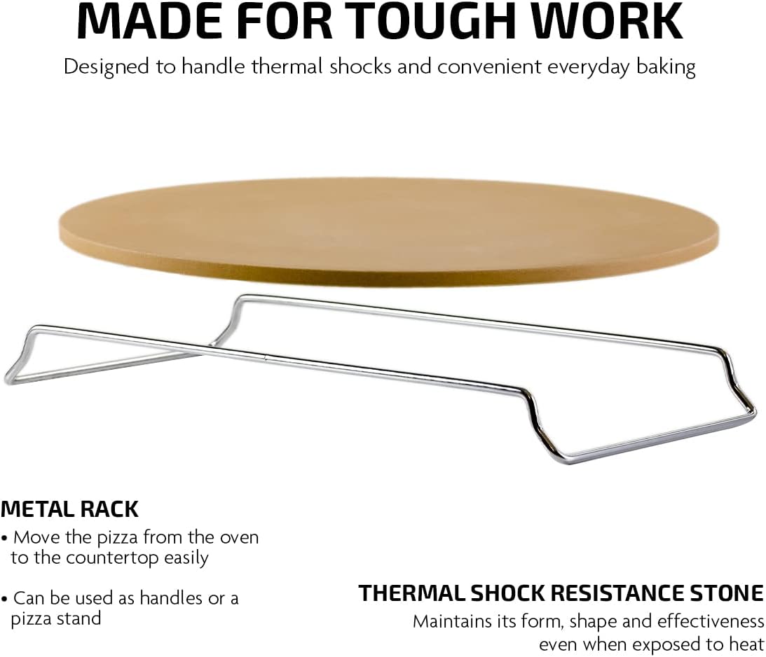 OVENTE Ceramic Flat 13 Inch Pizza Stone Set with Crust Cutter Wheel & Metal Rack/Handle, Compact Easy Storage Portable Baking Grilling Stone Thermal Shock Resistance for Oven Grill BBQ, Beige BW10132
