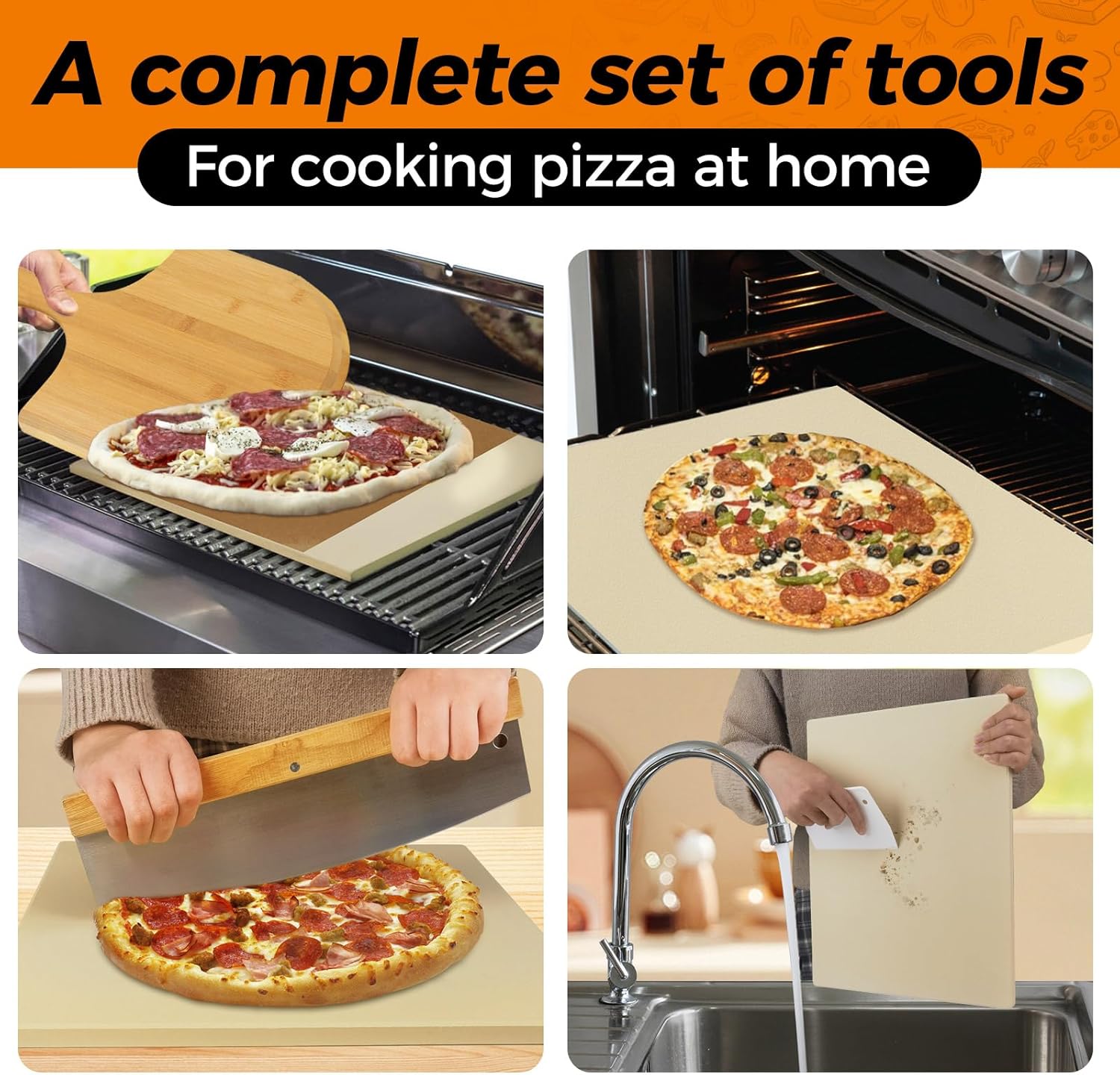 AUGOSTA Pizza Stone for Oven and Grill, 5 PCS Rectangle Pizza Stone Set, Durable and Safe Baking Stone 15 x 12 Inch with Pizza Peel, Pizza Cutter, Pizza Scraper & 10pcs Parchment Paper