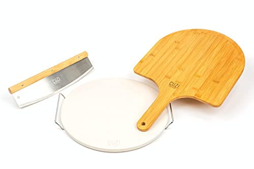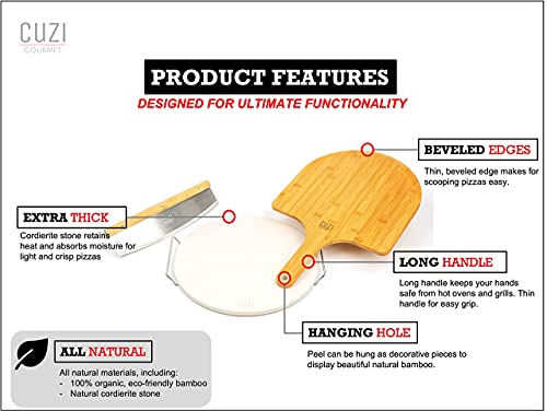 XL 4-Piece Pizza Stone Set - 15" Thermal Shock Resistant Cordierite Pizza Baking Stone, 22" Natural Bamboo Pizza Peel & Pizza Cutter Rocker - Large Pizza Stone for Grill and Oven