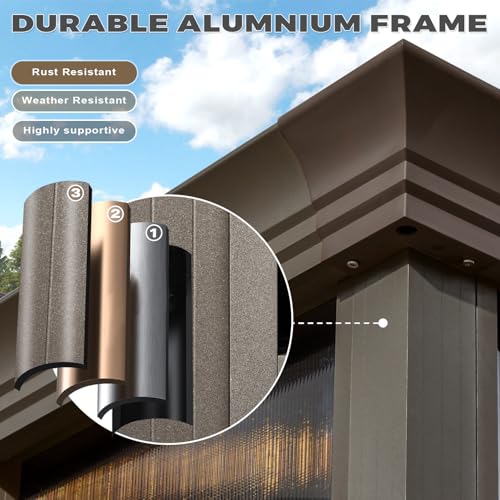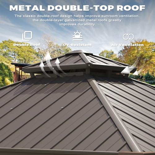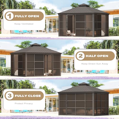 EROMMY 12' x 15' Sunroom, Solarium Gazebo with Aluminum Frame and Polycarbonate Roof, Outdoor Permanent Sun Room with Moveable PVC Screen and Sliding Door for Garden, Patio, Deck, Lawns