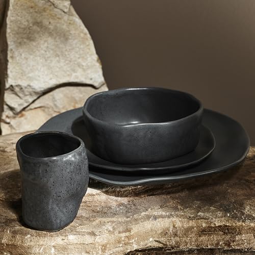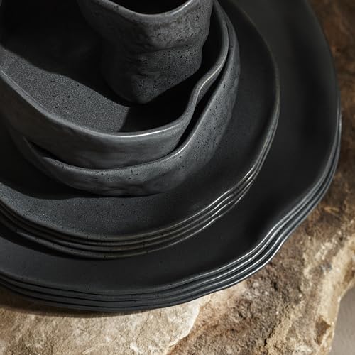 Atik Modern Stoneware 16-Piece Dinnerware Set, Plate and Bowl Set, Dish set for 4, Black