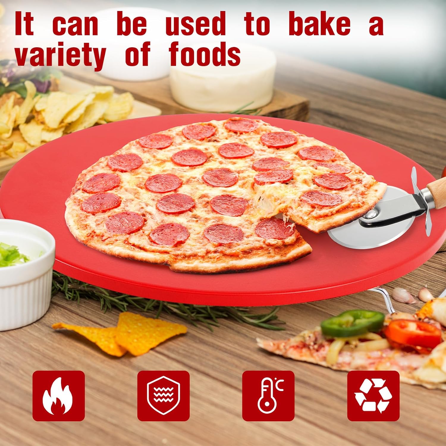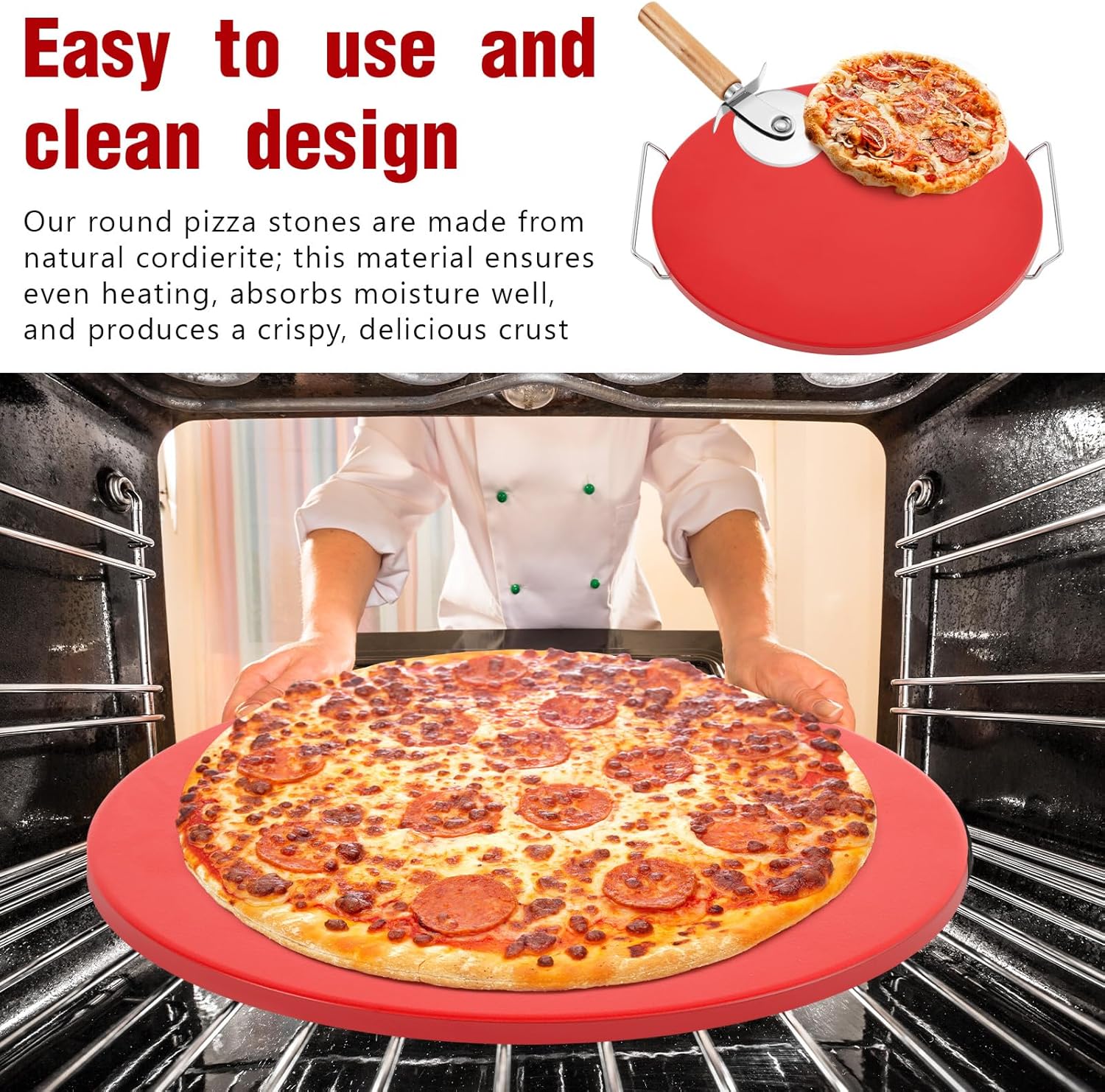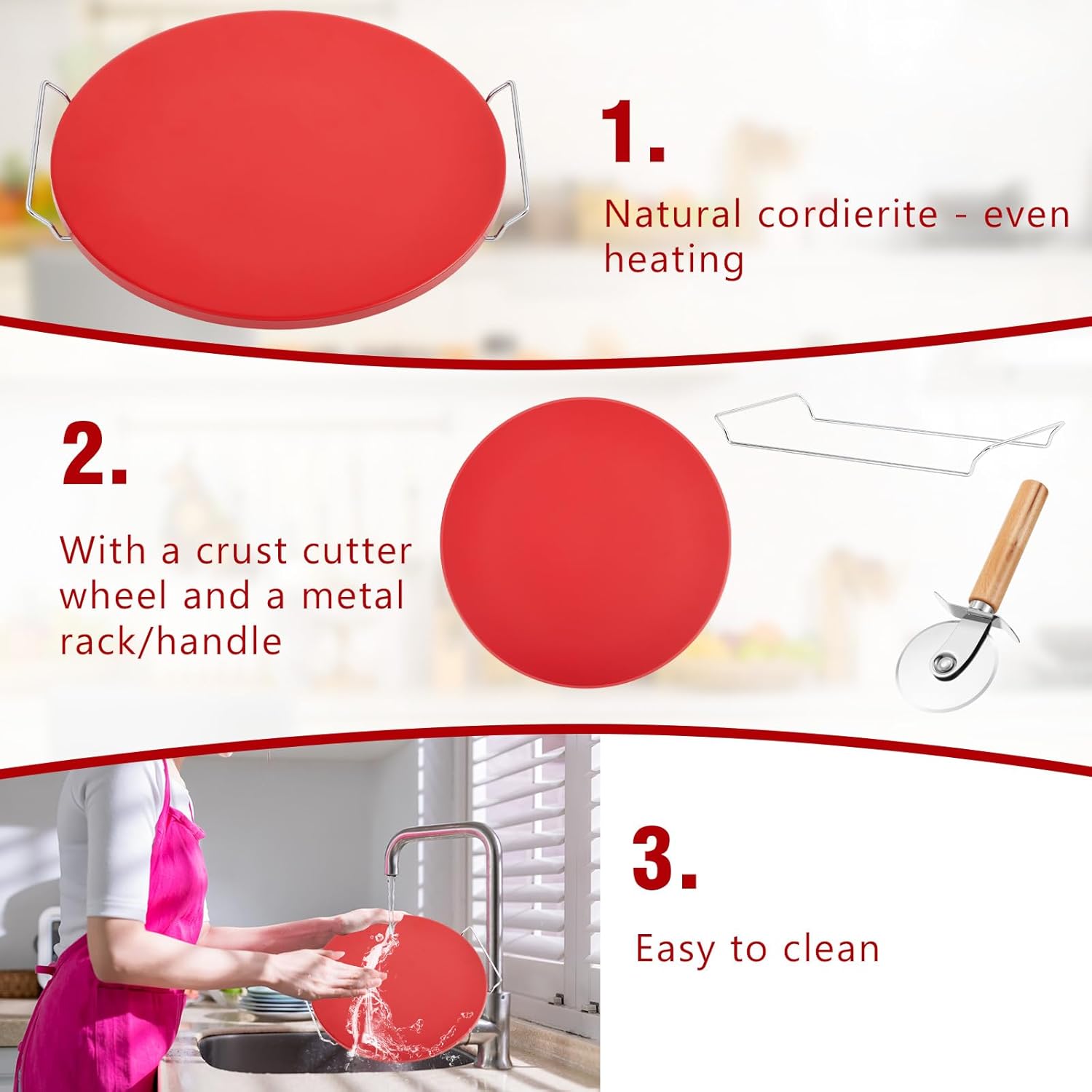 3 Pcs 15 Inch Pizza Stone Set with Cutter Wheel and Metal Serving Rack, Compact Portable Cordierite Baking Stone Easy Storage Grilling Stone for Oven Grill BBQ, Red