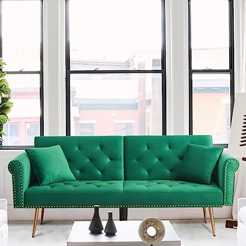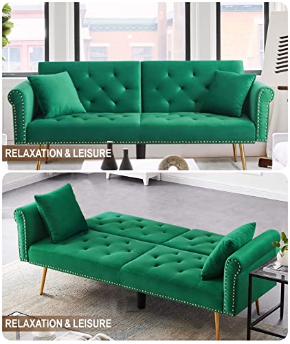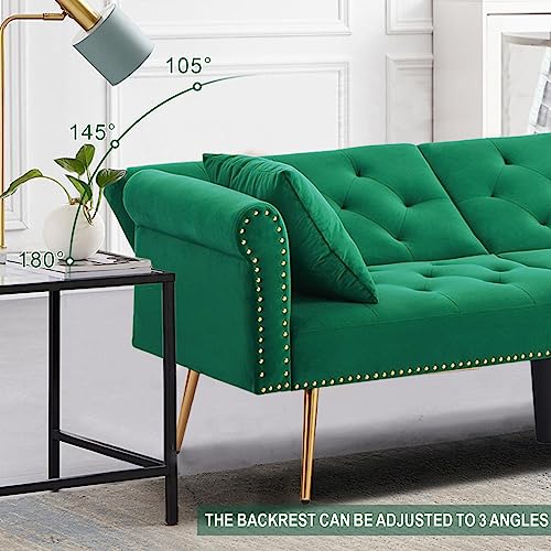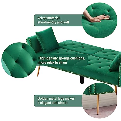 Velvet Futon Sofa Bed, Convertible Folding Sleeper Couch with 2 Pillows, 73" Tufted Loveseat Recliner with Golden Metal Legs for Living Room Apartment Office (Pink)