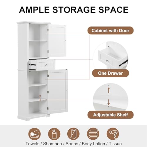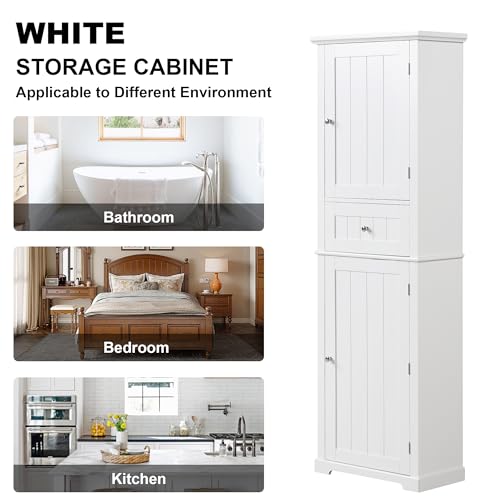Tall Bathroom Storage Cabinet, Freestanding Storage Cabinet with Drawer and Adjustable Shelf, MDF Board with Painted Finish, White