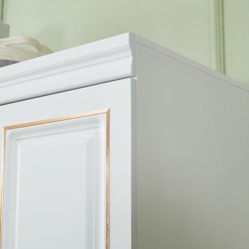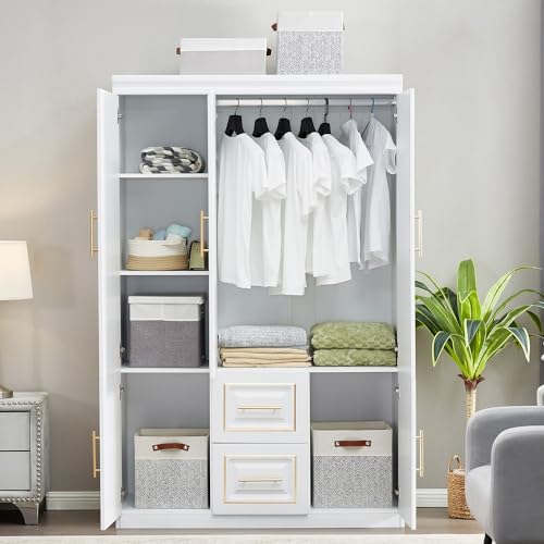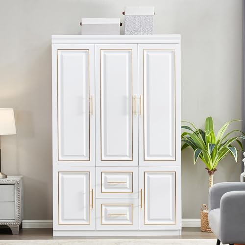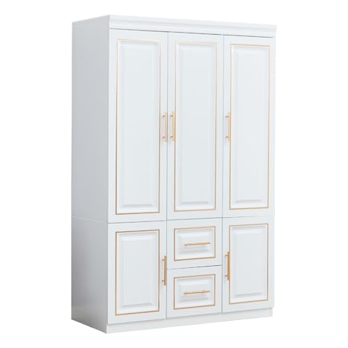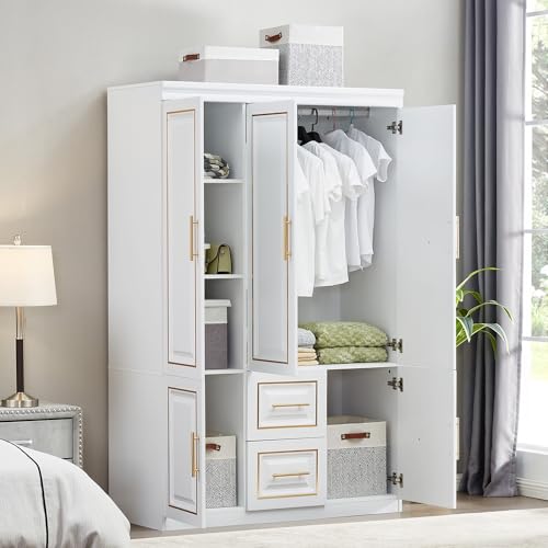 Closet with Doors Armoire Wardrobe Closets Wood Cabinet White Storage Closet Cabinet for Bedroom Armoires Clothes Wood Closet with Hanging Rod (20.51" D x 63" W x 74.02" H, Golden Handle)