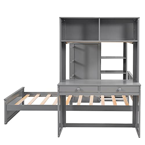 Twin Size Loft Bed with Desk and Wardrobe, Wood Loft Bed Frame with Storage Shelves and A Stand-alone Bed, Twin Over Twin Bunk Bed Frame for Kids Teens Adults (Bottom Bed Can Be Moved, Gray)