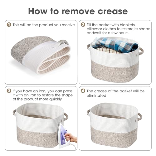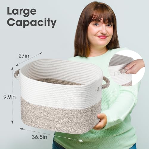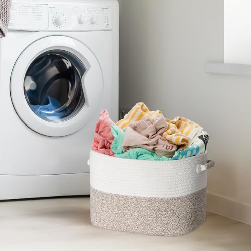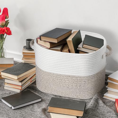 NiHome Hand Woven Cotton Rope Storage Basket 13.5"x11"x9.5", Stylish Decorative Shelf Storage Solution for Home, Office & Dorm Room, Easy-Grip Handles for Books, Toys, Supplies & More (White/Blue)
