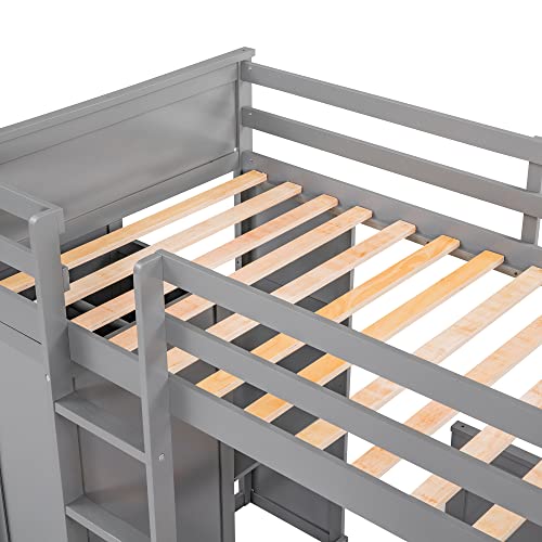 Full Size Loft Bed with Desk and Wardrobe, Solid Wood Loft Bed Frame with Storage Drawers, for Kids Teens Adults (Gray, Full)