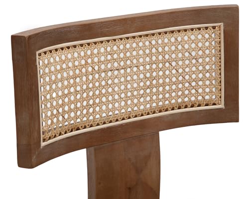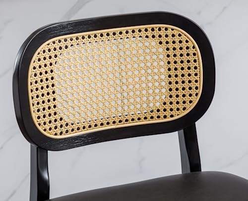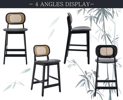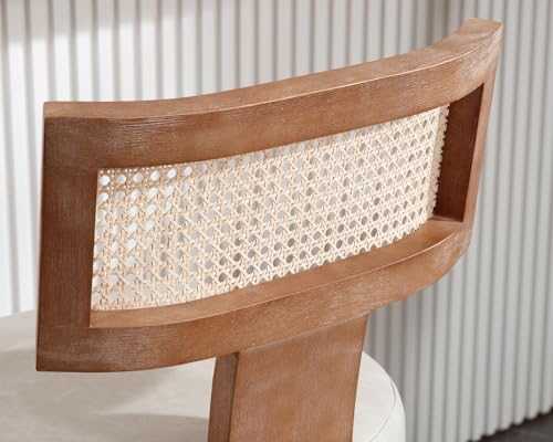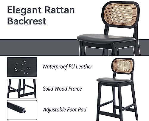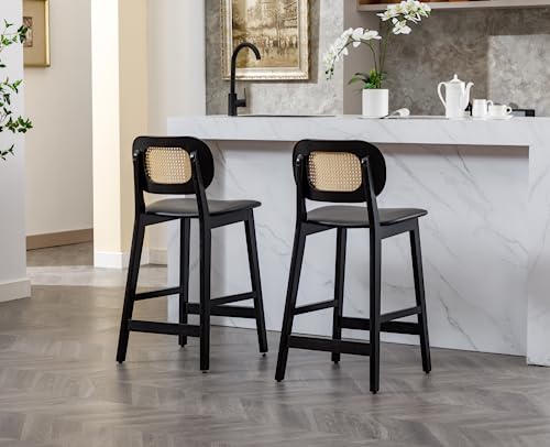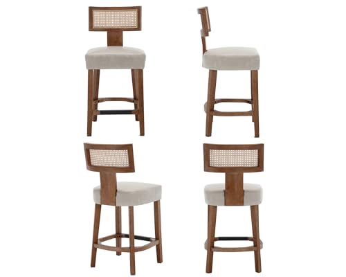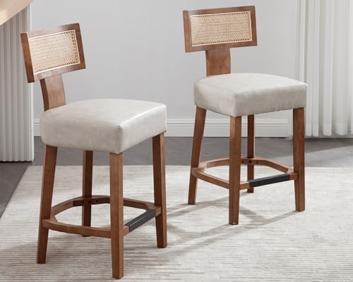Shunzhi Rattan Counter Height Bar Stools Set of 2 with Cane Back Upholstered Farmhouse Barstools Boho Wood Kitchen Island Chairs Comfy Bar Chairs for Pub/Home Bar, Linen Beige