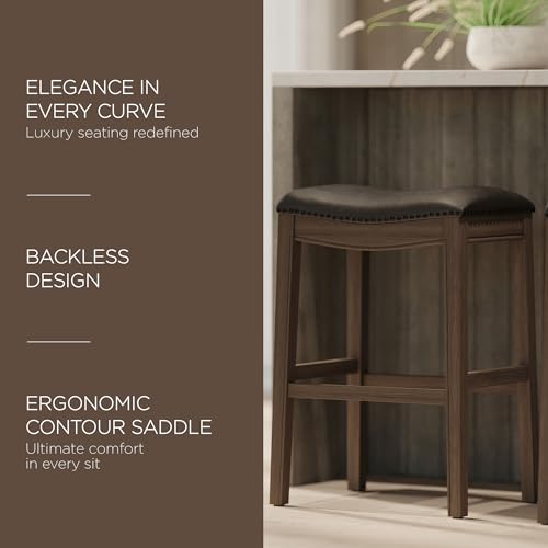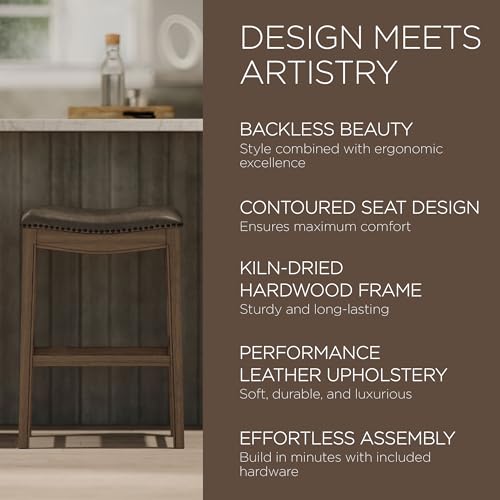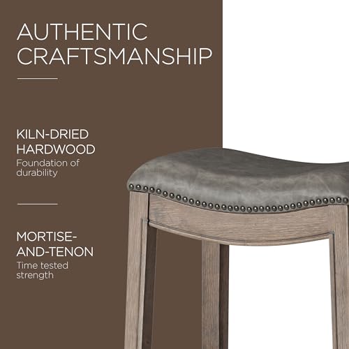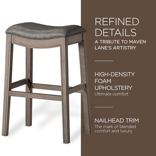 Maven Lane Adrien 31 Inch Bar Height Backless Saddle Barstool in Reclaimed Oak Finish with Ronan Stone Vegan Leather Cushion Seat, Set of 2