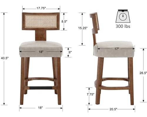 VESCASA Counter Height Barstools with Natural Wood Legs, 26.5" H Faux Leather Upholstered Counter Stool Chairs with Rattan Back Footrests for Kitchen Island, Bar, Pub, Set of 2, Light Grey
