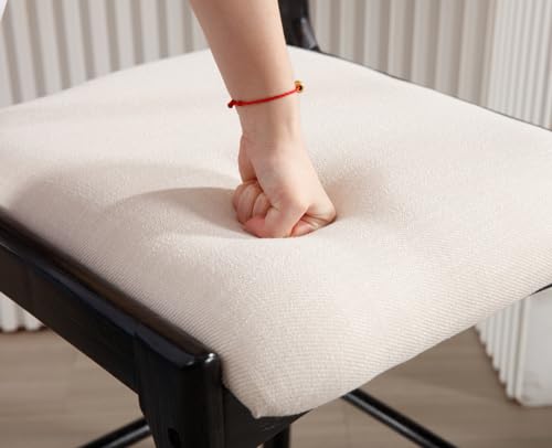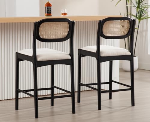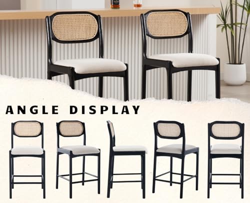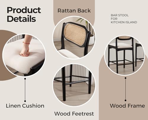EALSON Rattan Counter Height Bar Stools Set of 2 Farmhouse Barstools with Cane Back Comfortable Linen Upholstered Bar Chairs Mid Century Modern Wood Counter Stools for Kitchen Island, Beige