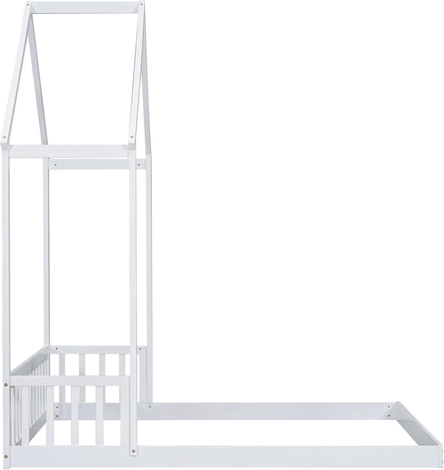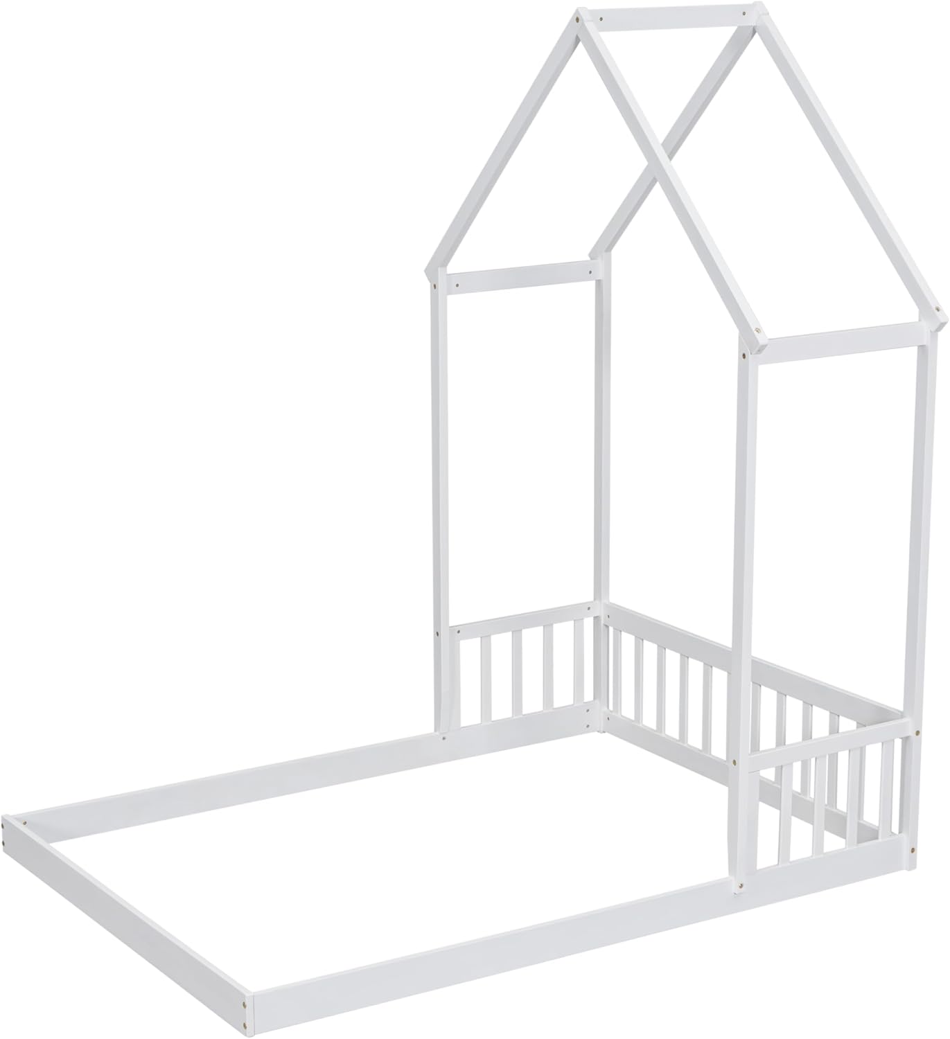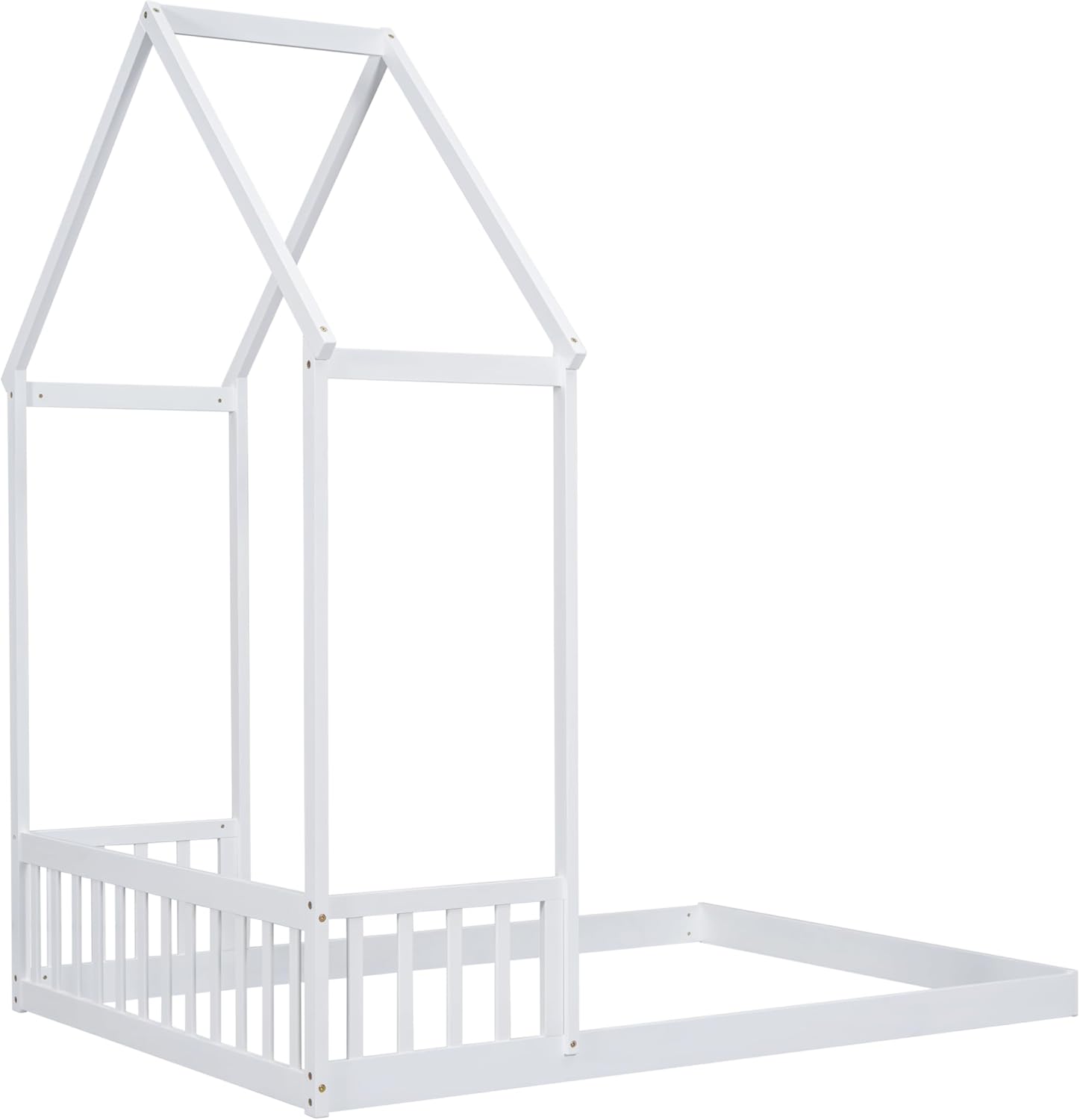 Full Size Roof-Framed Headboard Floor Bed-frame with Guardrails,Bedroom Wood Platform Bed w/Fenced Design,without Slats, for Teens Boys Girls,White
