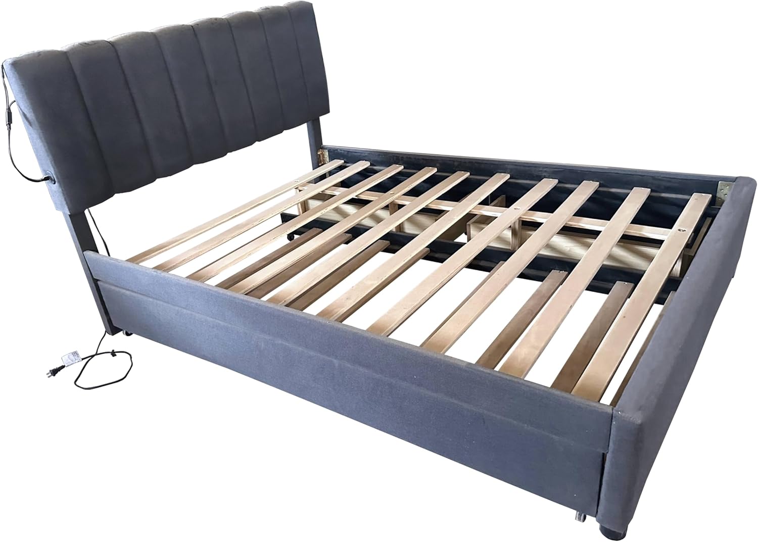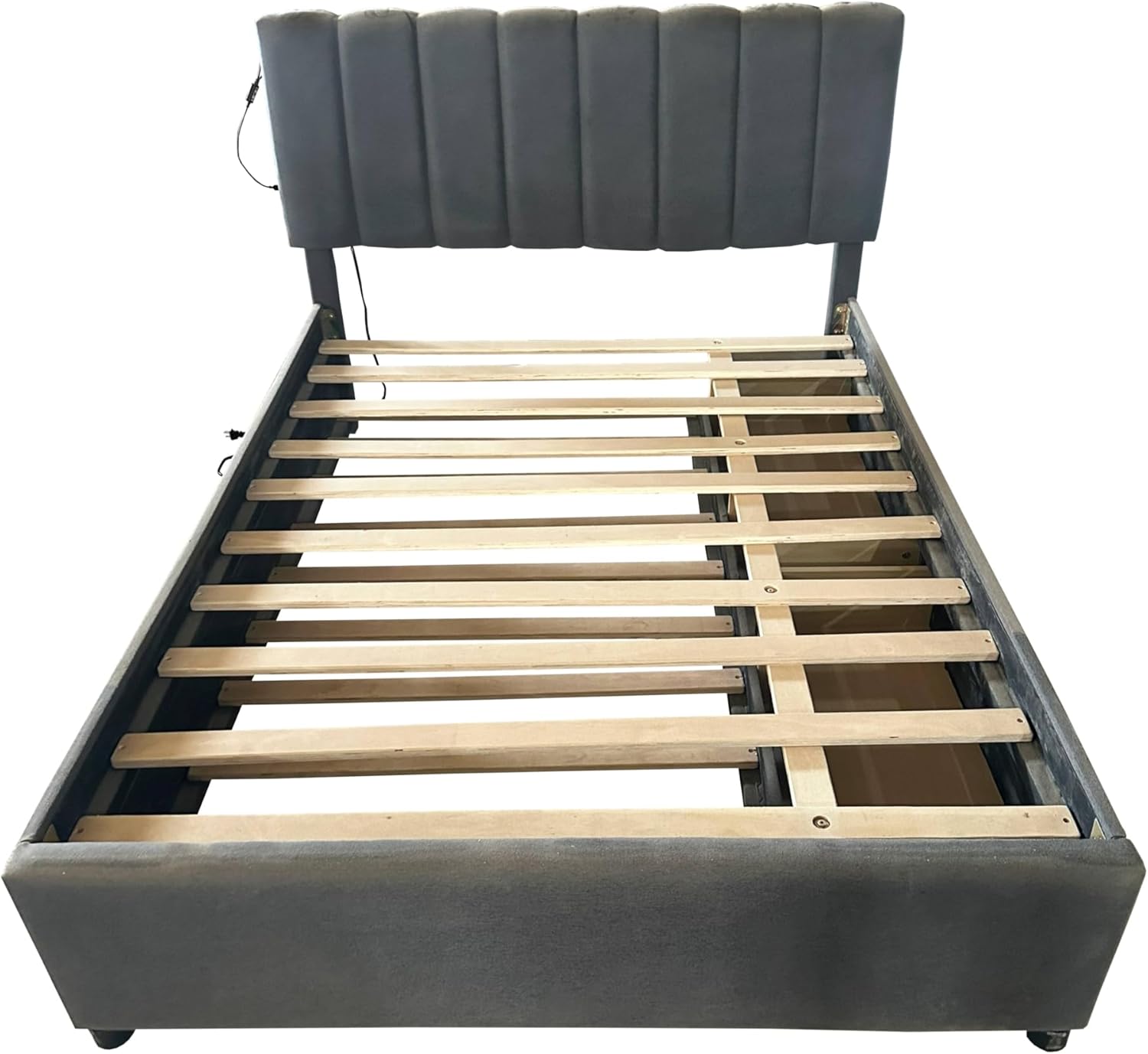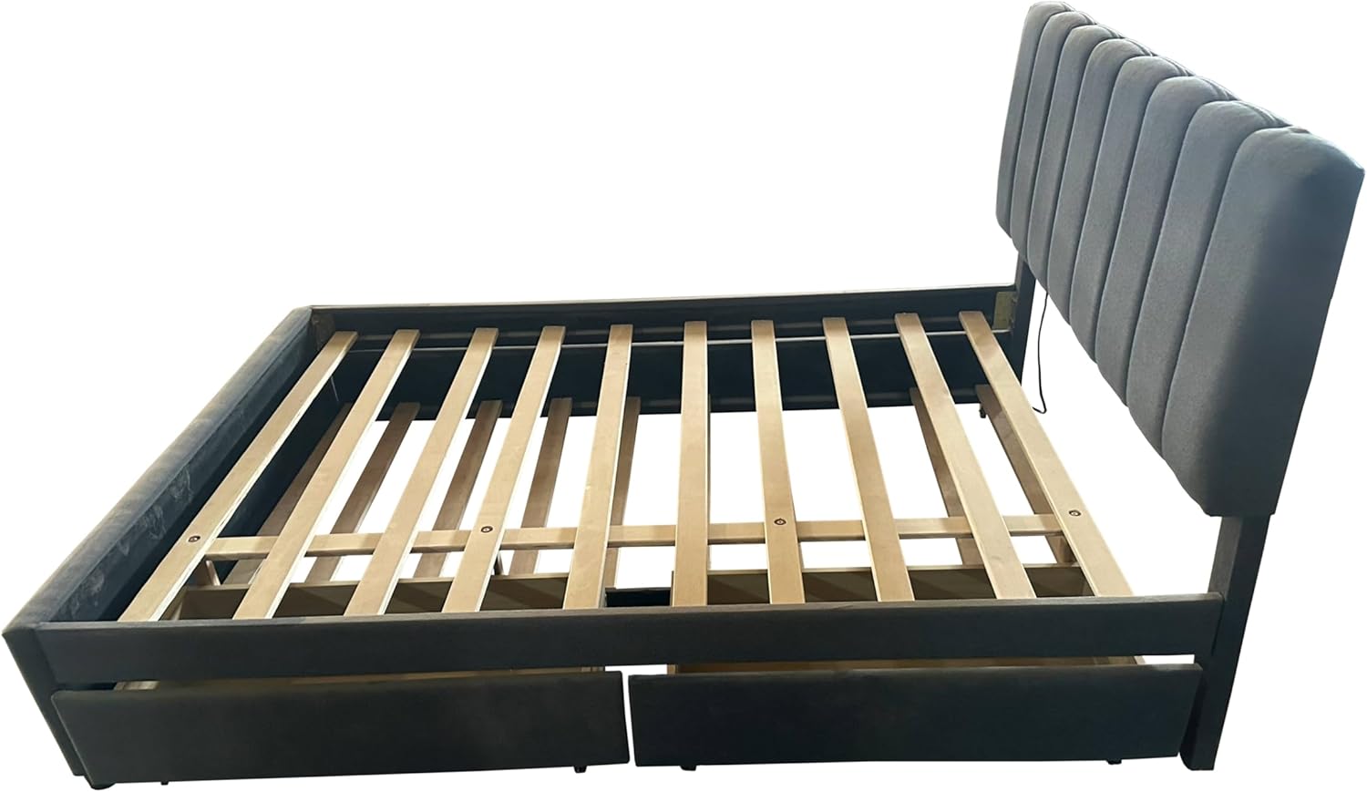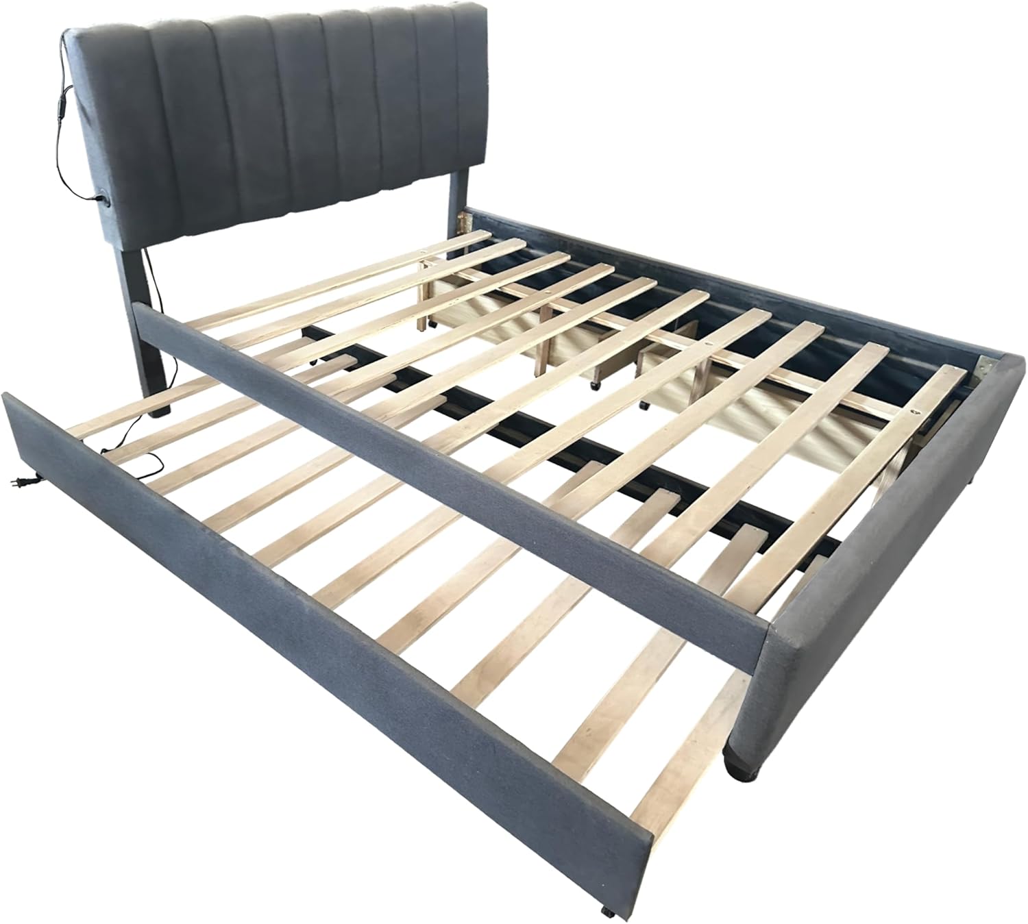 Full Size Upholstered Platform Bed with Trundle & Two Drawers, Solid Wood Bedframe w/Led Light, No Box Spring Needed, for Dorm, Bedroom, Guest Room, Gray