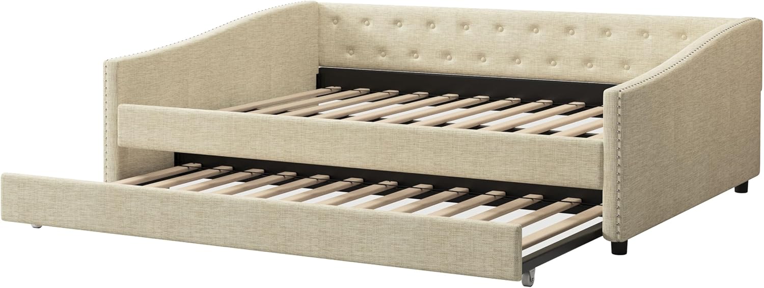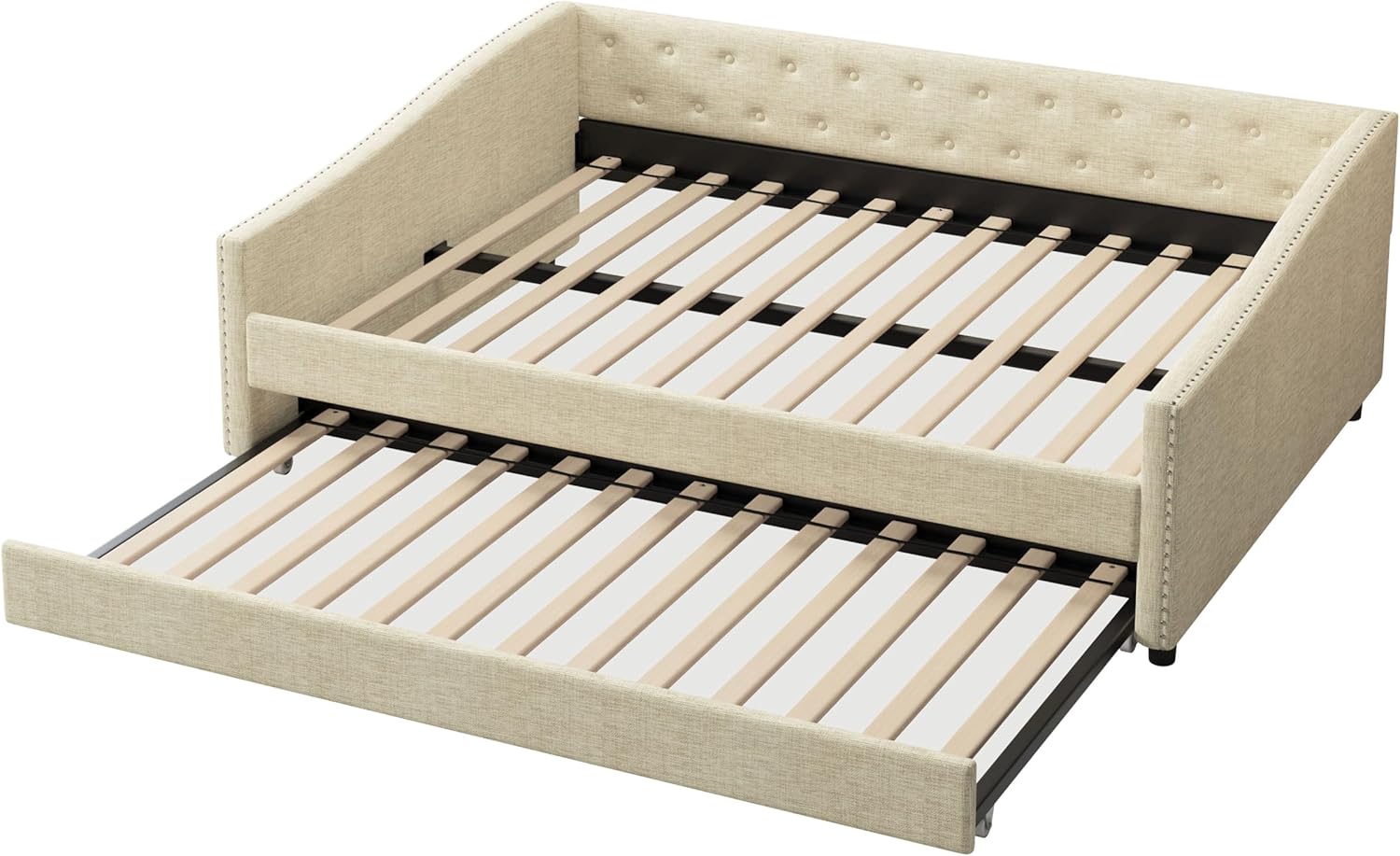 Full Size Daybed with Twin Size Trundle Upholstered Tufted Sofa Bed, with Button on Back and Copper Nail on Waved Shape Arms, Beige