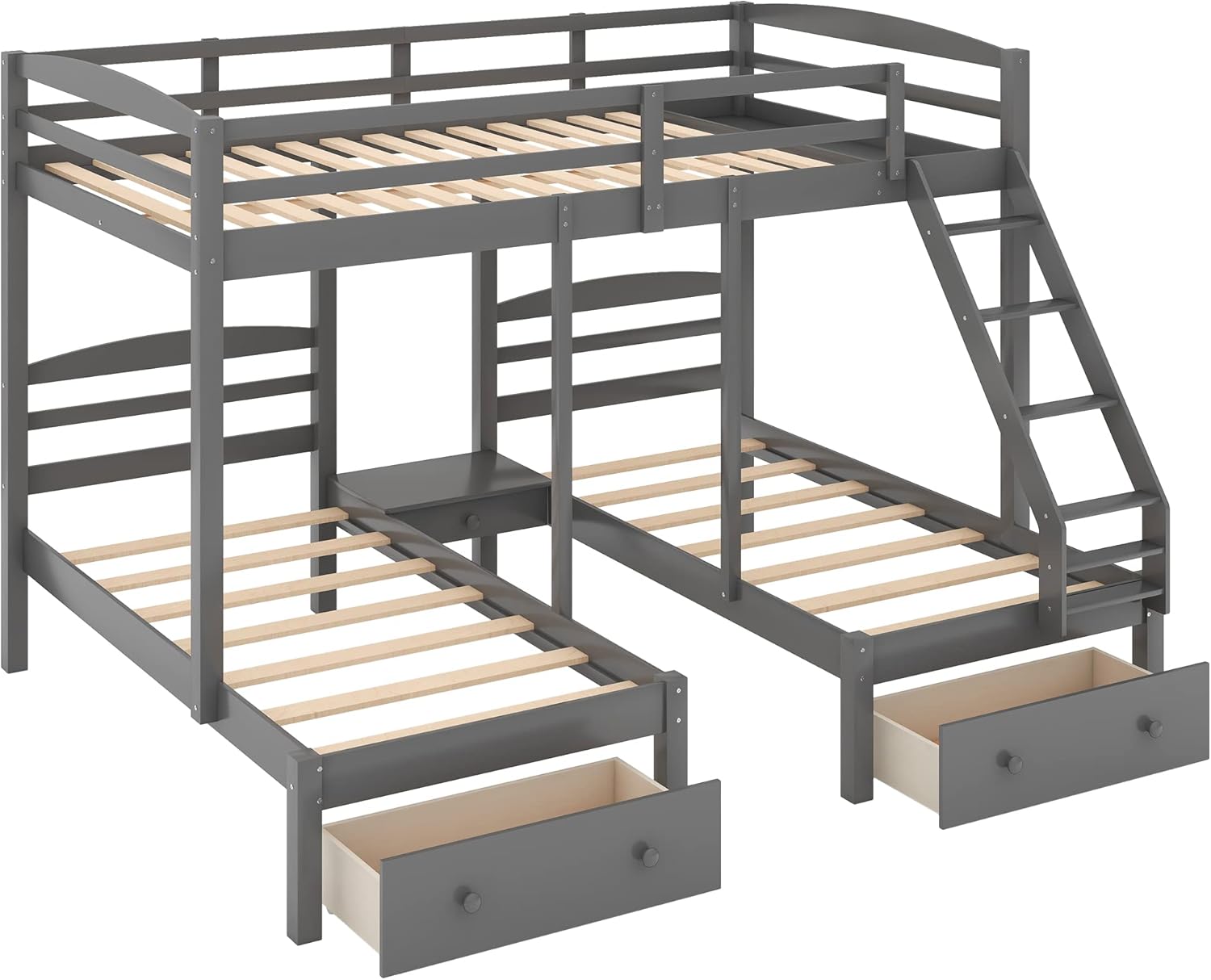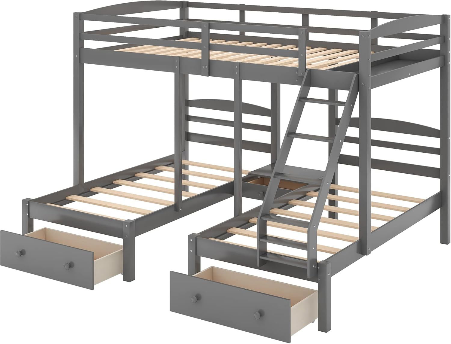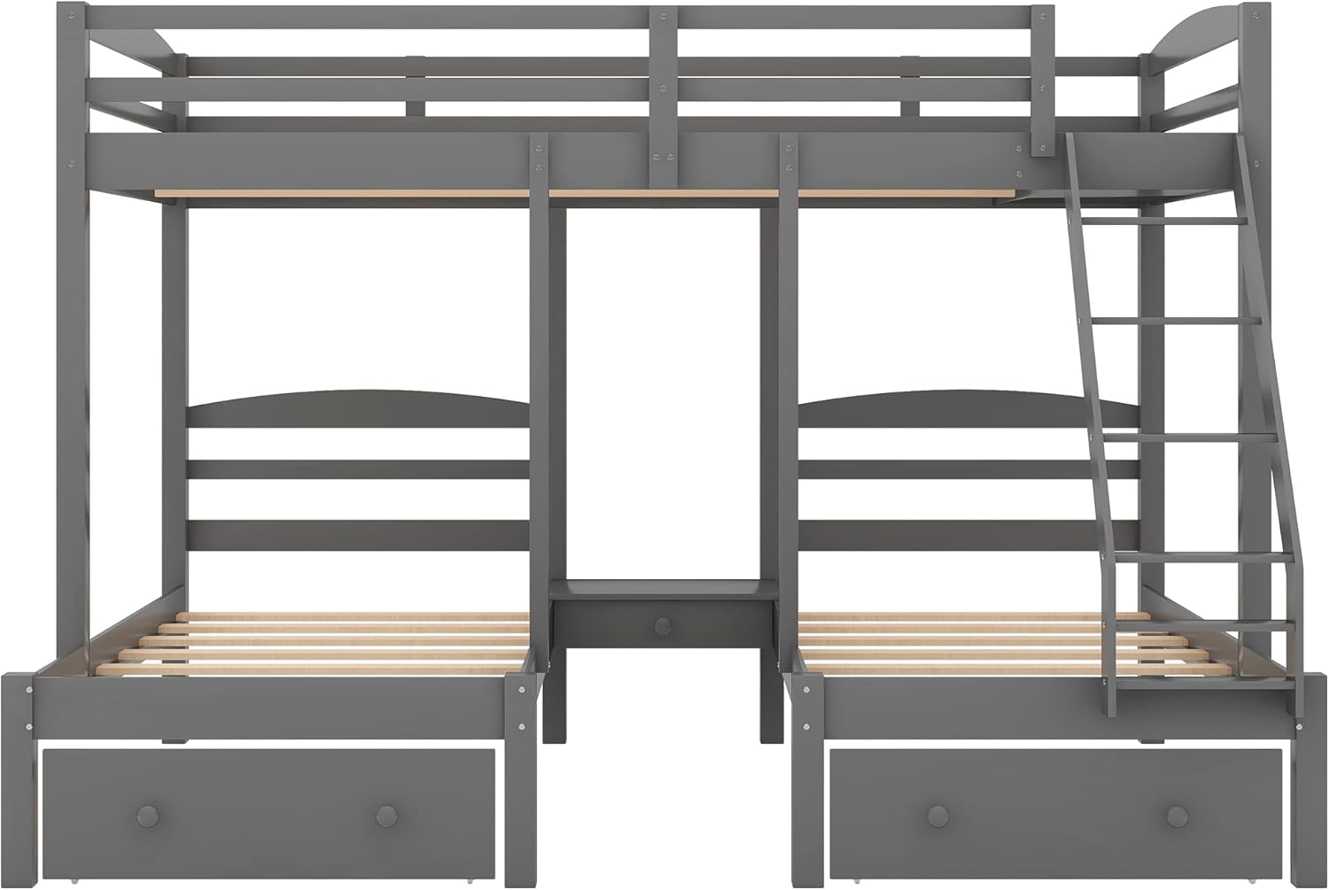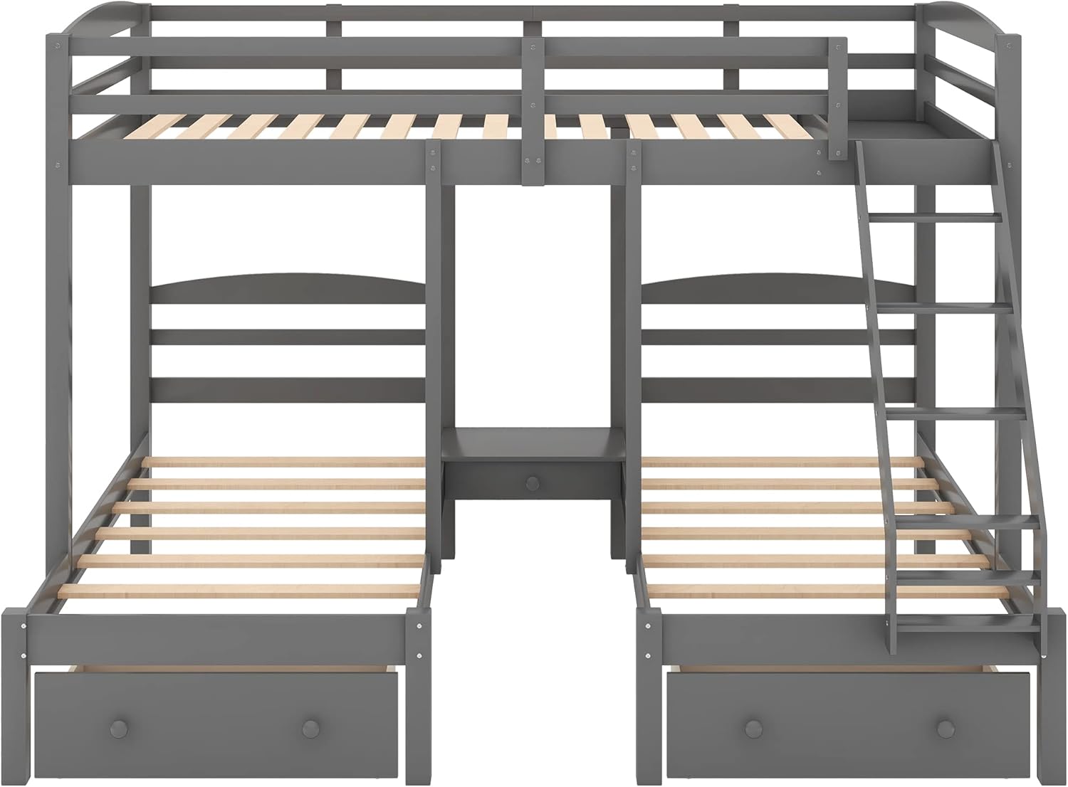 Full Over Twin & Twin Triple Bunk Bed with Storage Drawers, Wood Bedframes with Built-in Ladder for 3 Kids Teens Boys Girls, Gray