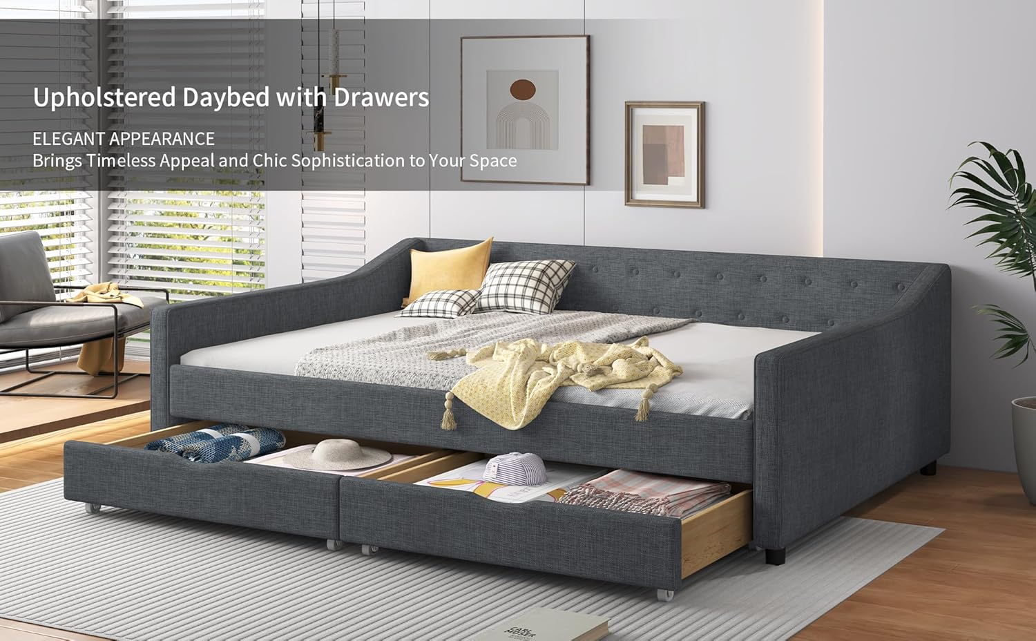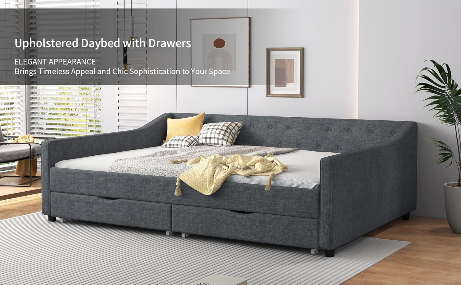 Ball & Cast Full Bed Frame with Storage,Full Size Daybed with 2 Storage Drawers,w/Button Tufted Backrests, Strong Wood Slat Support,Bedroom furniture(Dark gray)