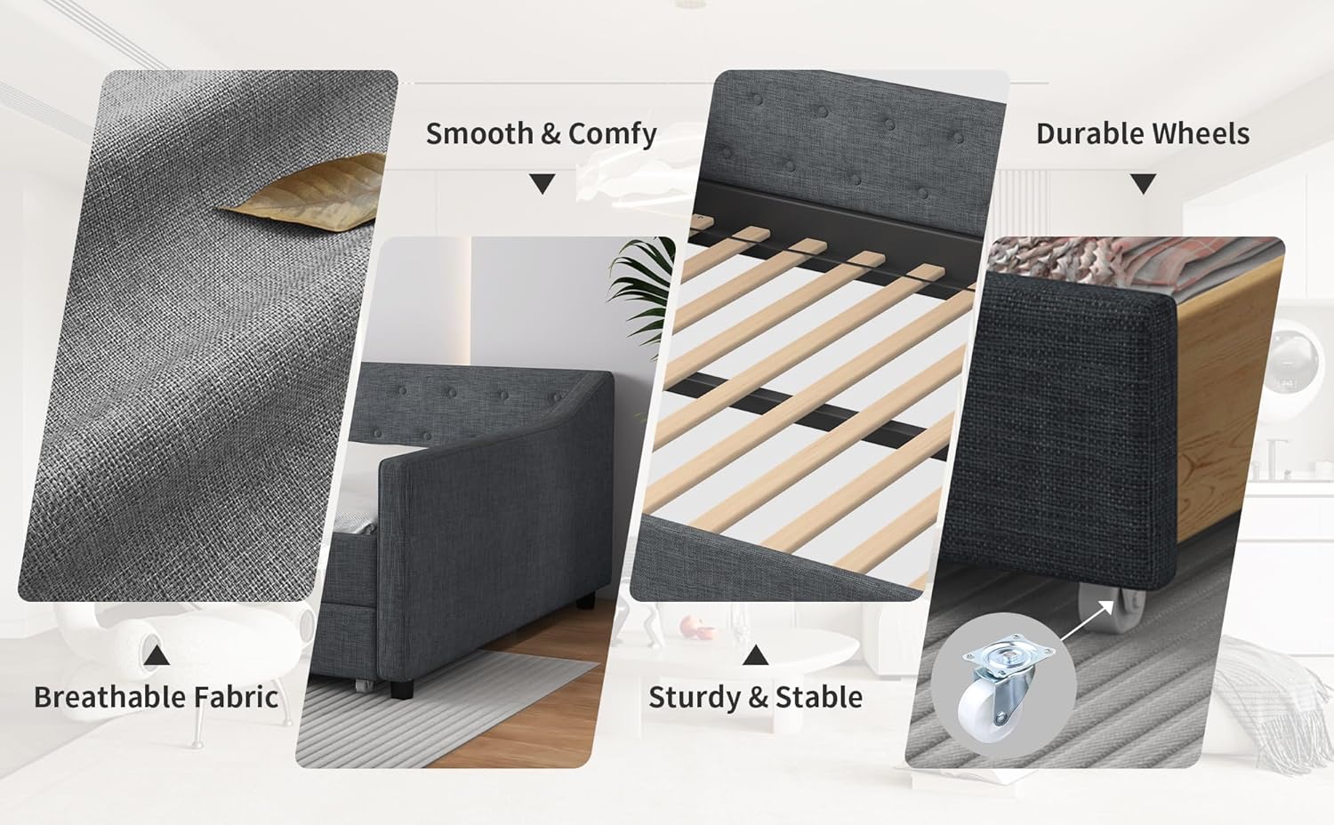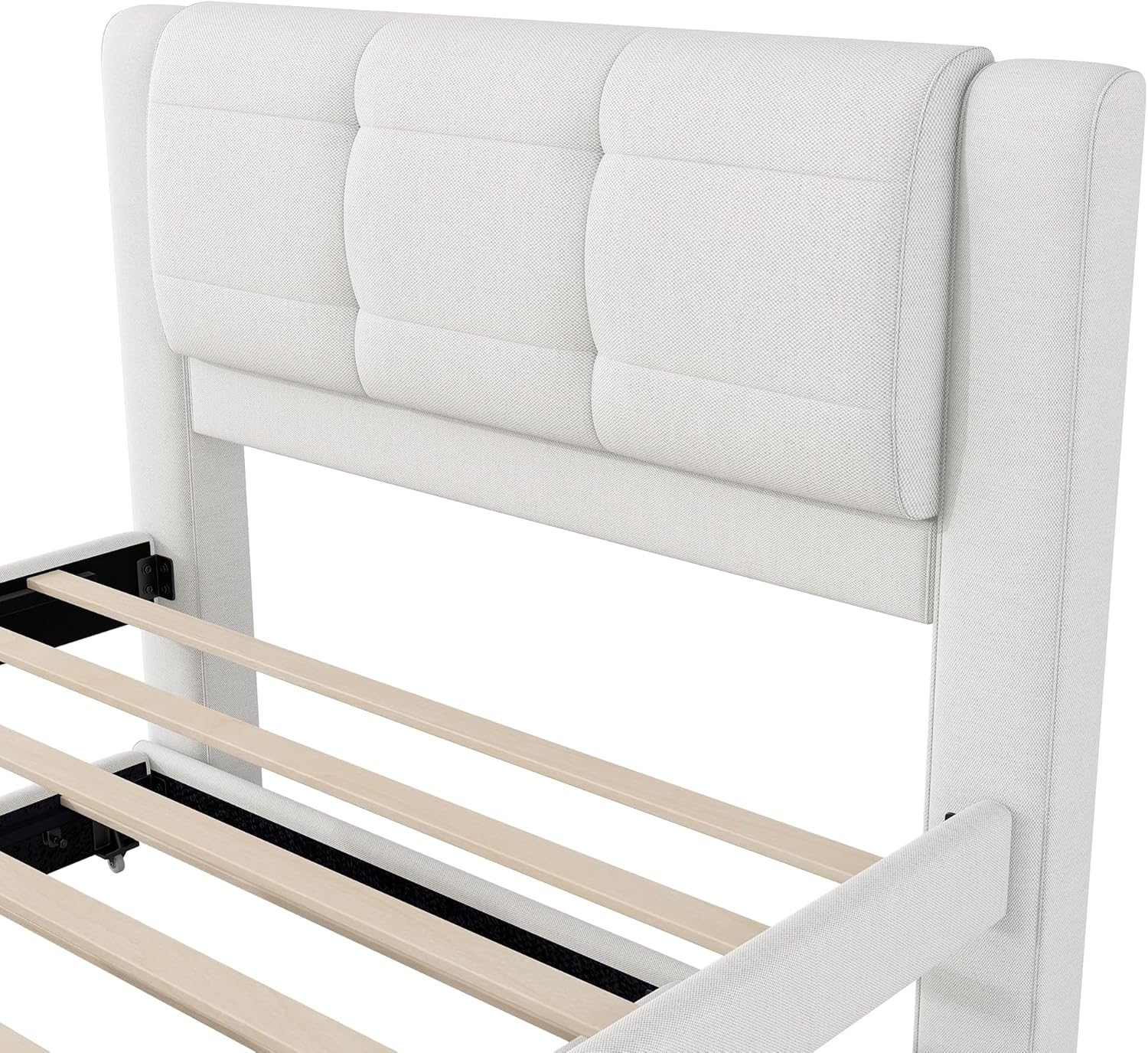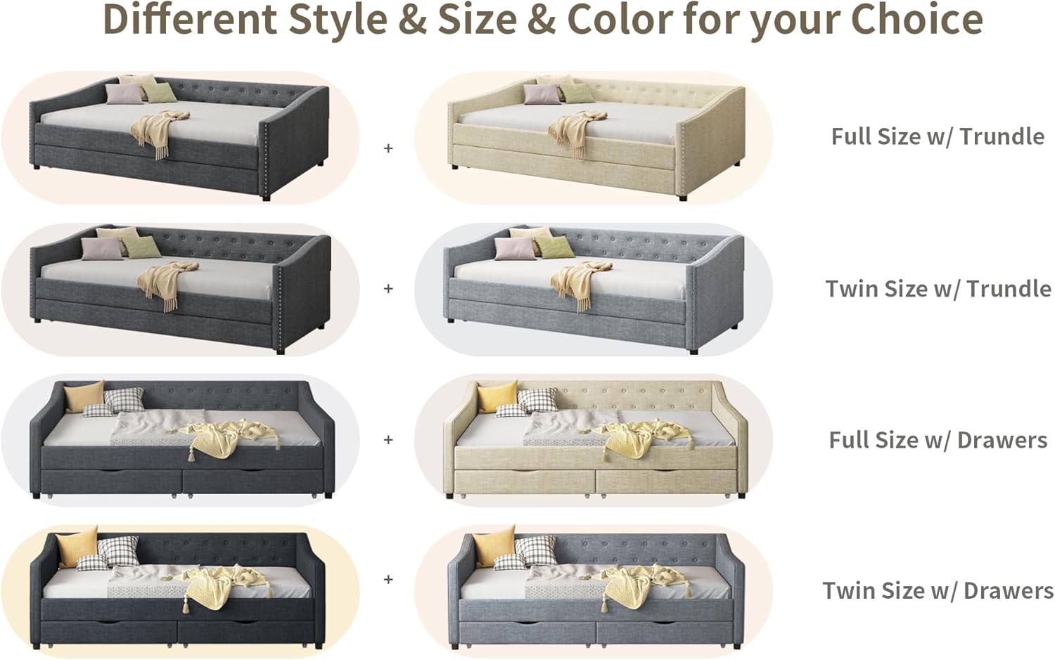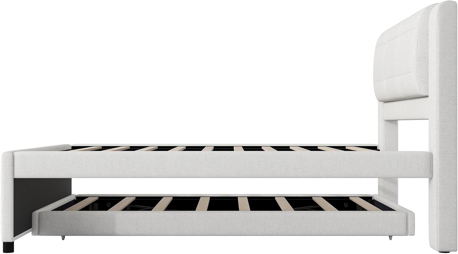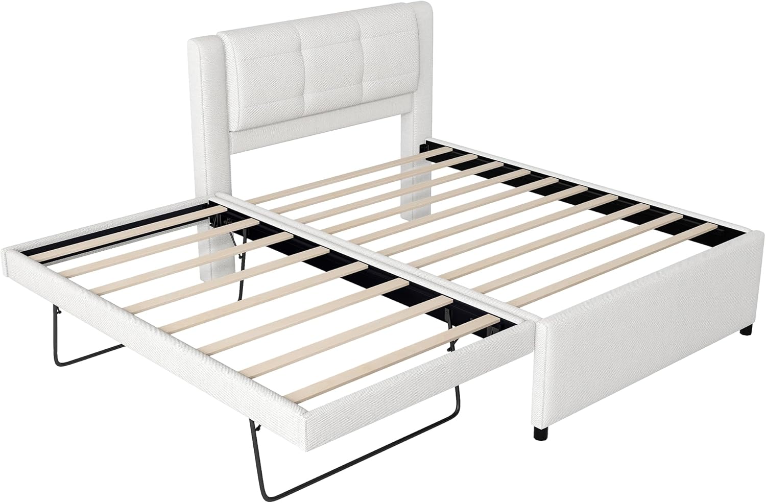 Full Size Bed Frame with Twin Size Trundle Bed, Linen Upholstered Platform Bed with Tufted Headboard, Full Bed Frame with Strong Wooden Slats, Easy Assembly Trundle can be Flat or erected