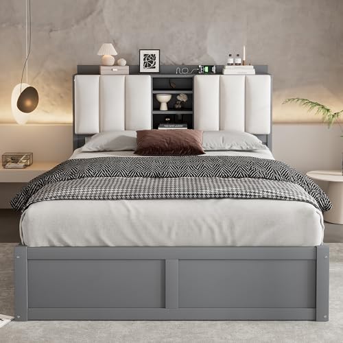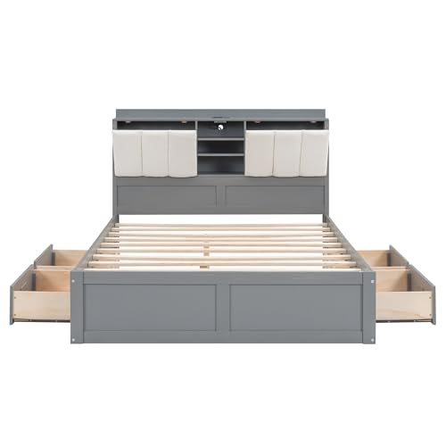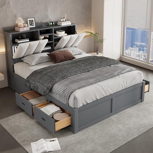 Full Size Bed Frame with 4 Storage Drawers, Wood Full Size Platform Bed with Storage Headboard, Full Storage Bed with Support Legs for Girls Boys, No Box Spring Needed (Gray-009)