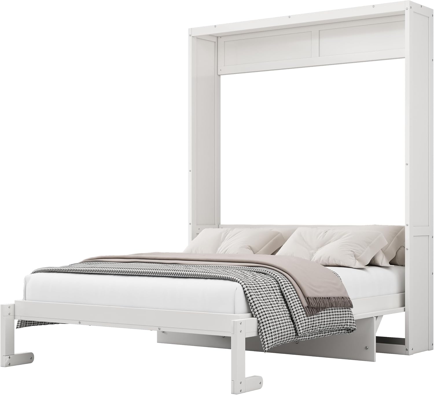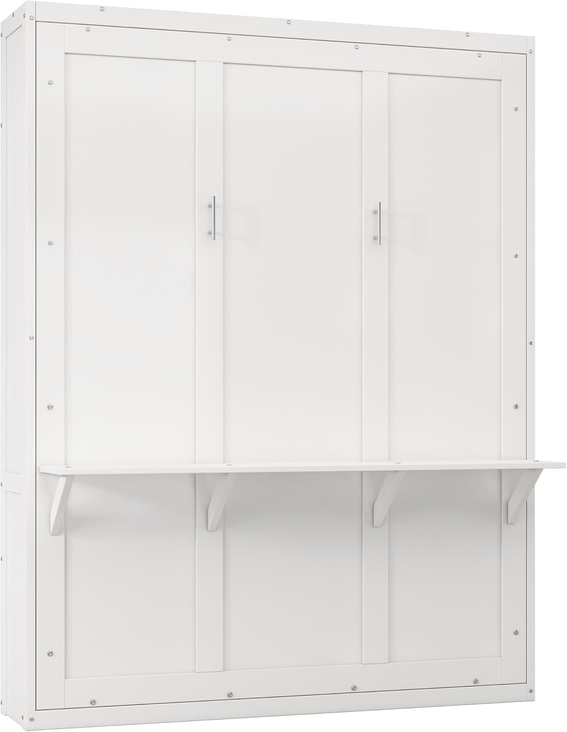 Murphy Bed Frame Full Size, Wall Beds with A Storage Shelf, Wood Folding Cabinet Bed with Desk for Home Office Studio, White
