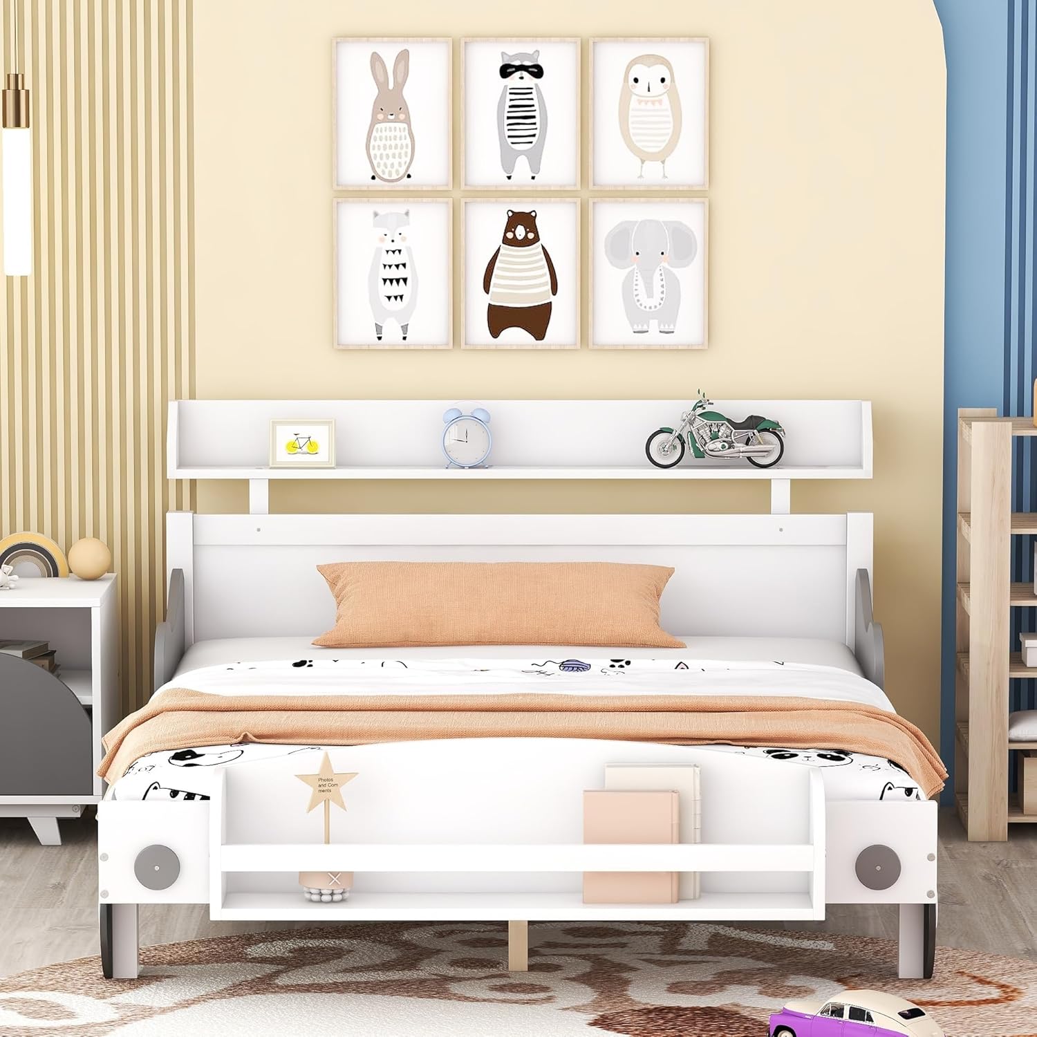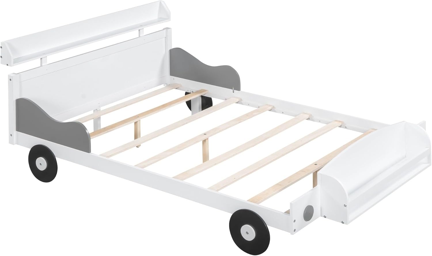 Full Size Car-Shaped Platform Bed with Wheels Storage Shelf for Bedroom Frame White Modern Contemporary Nature Wood Natural Finish Handmade Includes Hardware