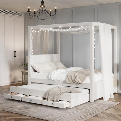 Wooden LED Canopy Platform Bed, 4 Poster Canopied Full Size Bed Frame with Headboard and Slat Support, Bedroom Mattress Foundation for Kids, Teens, Adults, No Box Spring Needed Easy Assembly