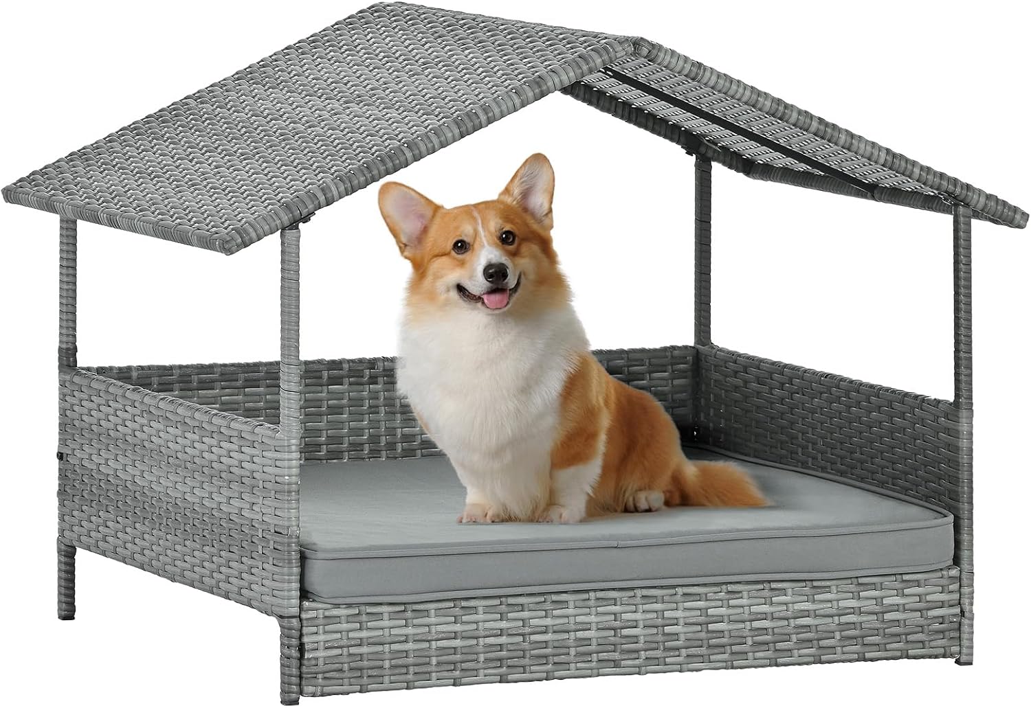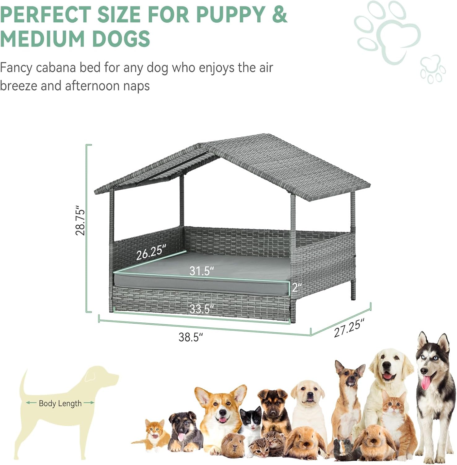 32" Wicker Dog House with Canopy, Indoor/Outdoor Elevated Rattan Dog Bed with Water-Resistant Soft Cushion, Large Outside Raised Dog Shelter with Roof for Small, Medium, and Large Dogs, Gray