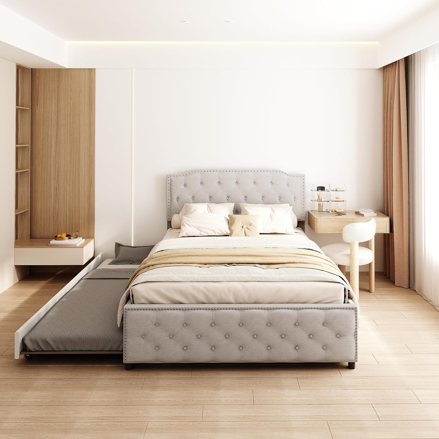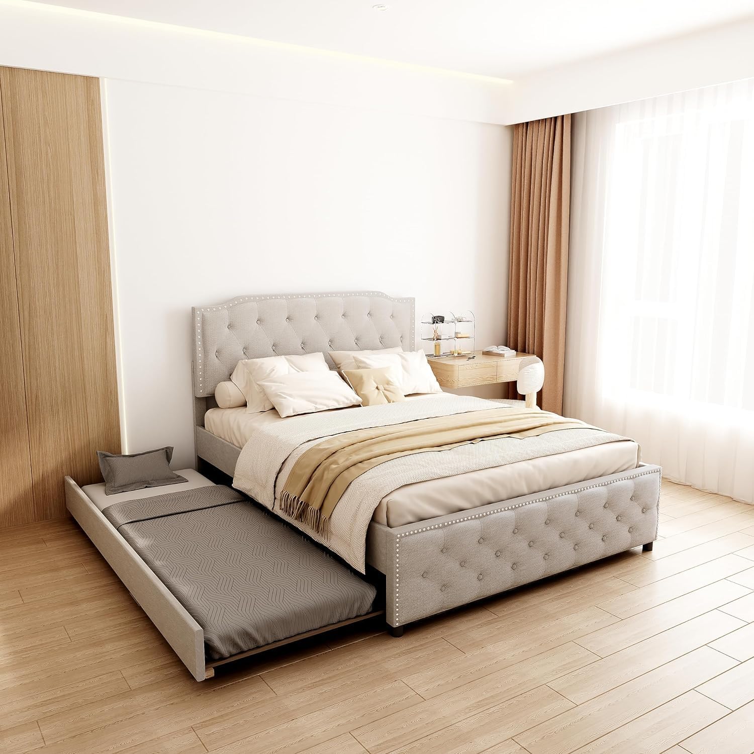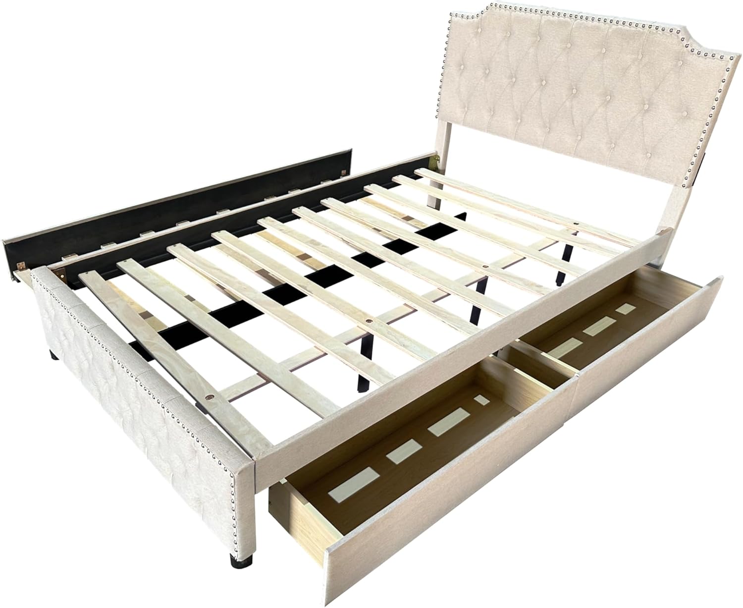 Upholstered Full Size Platform Bed with Trundle & 2 Storage Drawers,Solid Wood Bedframe w/Headboard/Wood Slat Support, Easy to Assemble, No Box Spring Needed, Beige