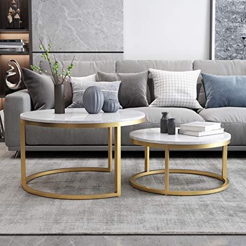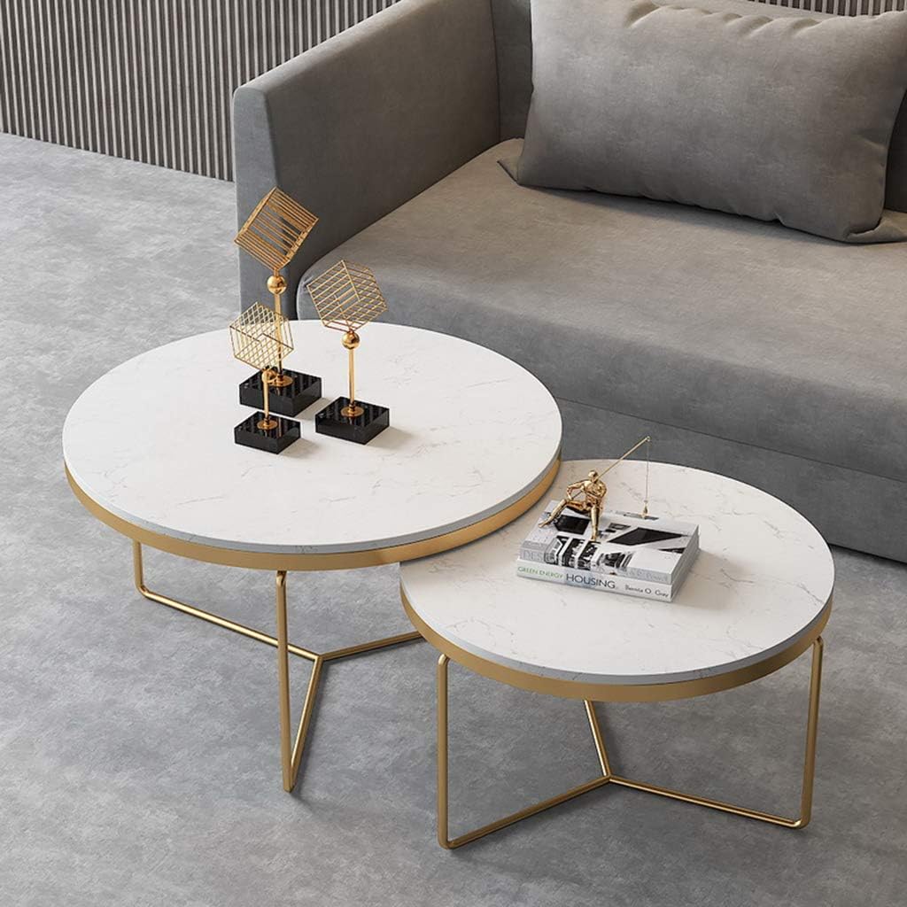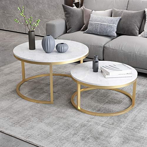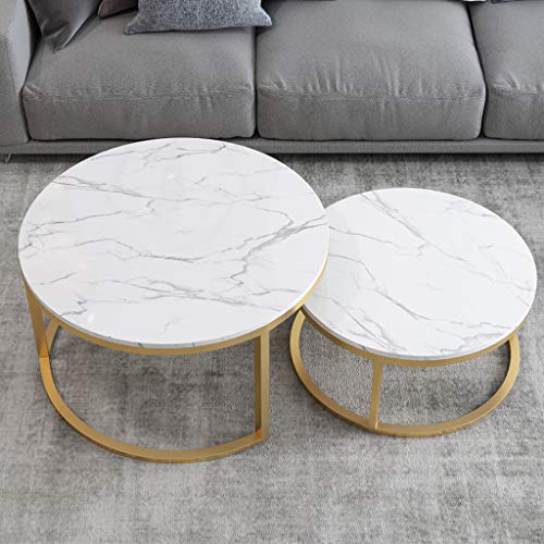 Set of 2 Stackable Coffee Tables for Living Room, Round Elegant Nest Side Tables, Stacking Marble Texture & Metal Coffee Nesting End Tables