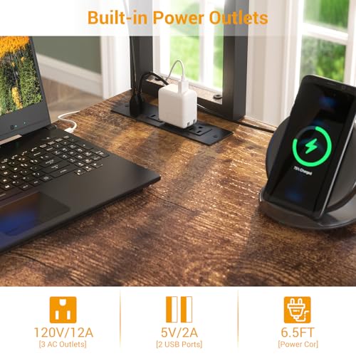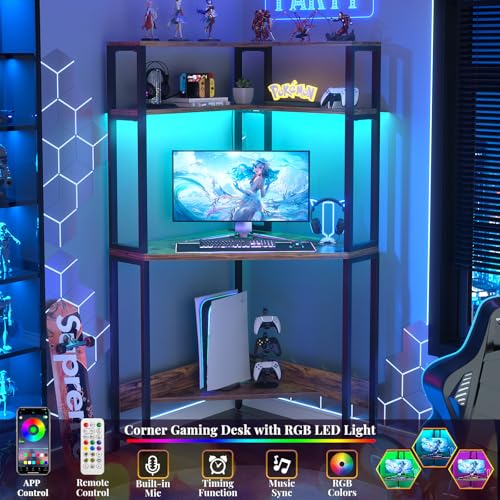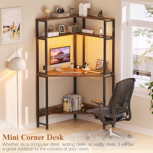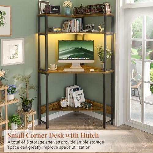 Cyclysio Mini Corner Desk with Hutch, Corner Gaming Desk with LED Light, Corner Computer Desk with Power Outlets, Triangle Corner Desk for Small Space, Home Office, Workstation, Brown