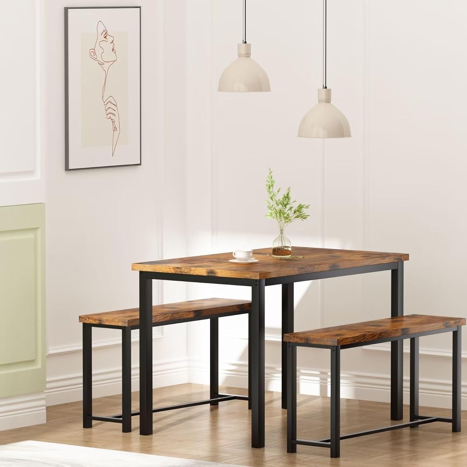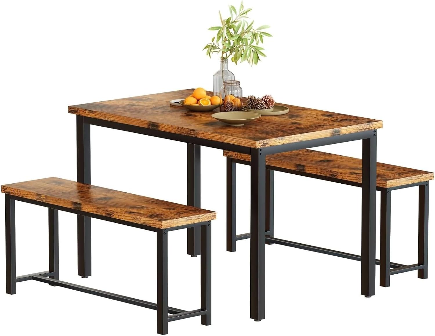 Overstock Industrial 3-Piece Dining Table Set, Retro Wood Kitchen Table Set with 2 Benches for Home Kitchen, Dining Room, Restaurant Rustic Brown