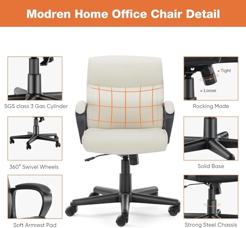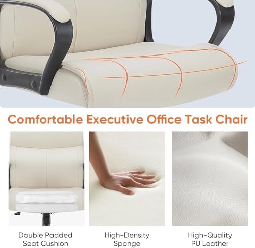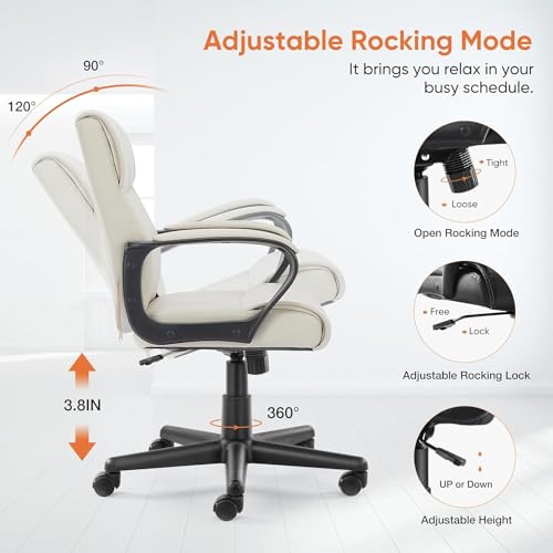 Sweetcrispy Office Chair Computer Desk Chair with Padded Armrests, Ergonomic Chair Mid Back Lumbar Support and Adjustable Height Home Office Desk Chairs PU Leather Swivel Chair, Cream